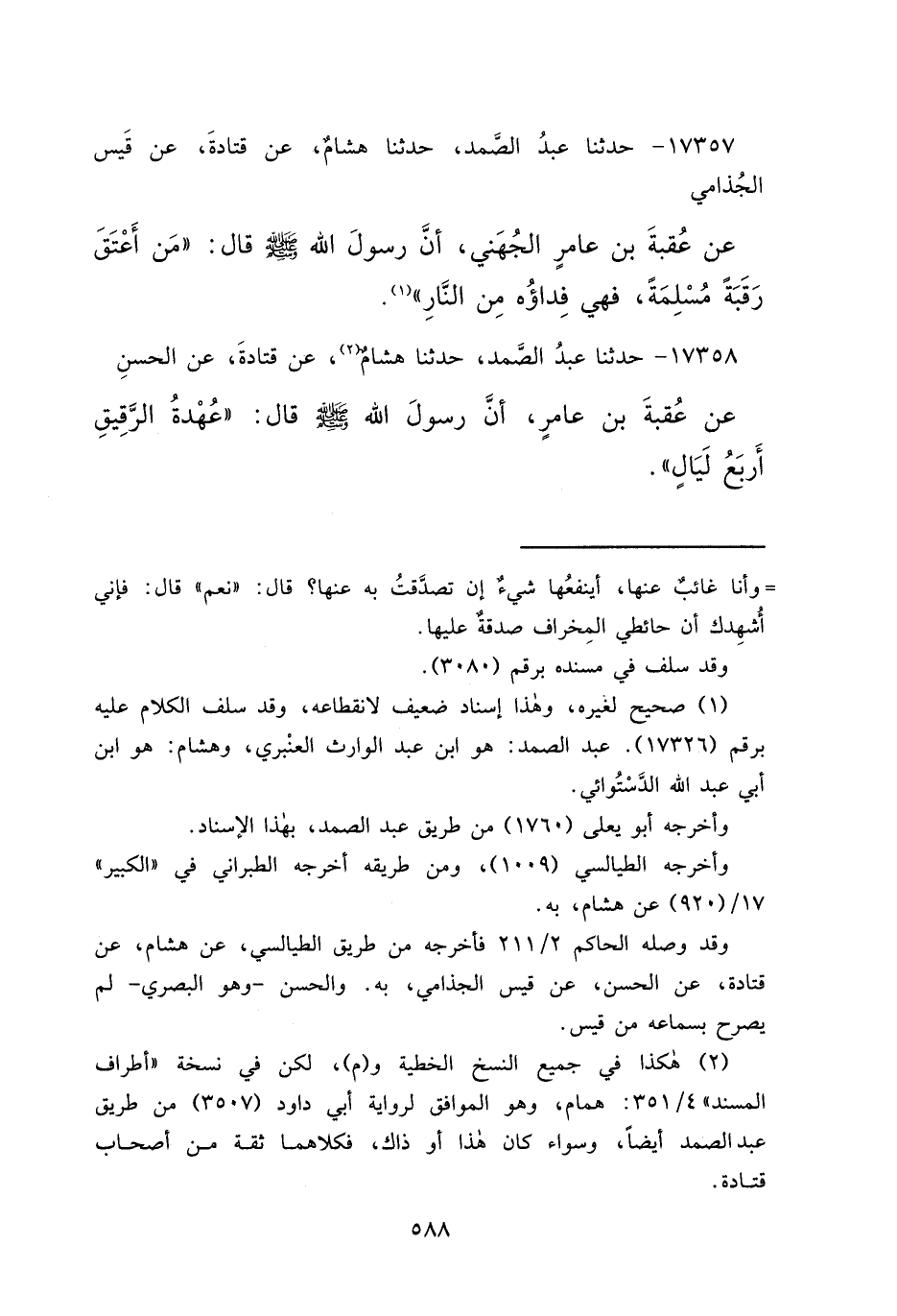 ١٧٣٥٧ - حَدَّثَنَا عَبْدُ الصَّمَدِ، حَدَّثَنَا هِشَامٌ، عَنْ قَتَادَةَ، عَنْ قَيْسٍ الْجُذَامِيِّ، عَنْ عُقْبَةَ بْنِ عَامِرٍ الْجُهَنِيِّ، أَنَّ رَسُولَ اللهِ صَلَّى اللهُ عَلَيْهِ وَسَلَّمَ قَالَ: " مَنْ أَعْتَقَ رَقَبَةً مُسْلِمَةً، فَهِيَ فِدَاؤُهُ مِنَ النَّارِ " (١)