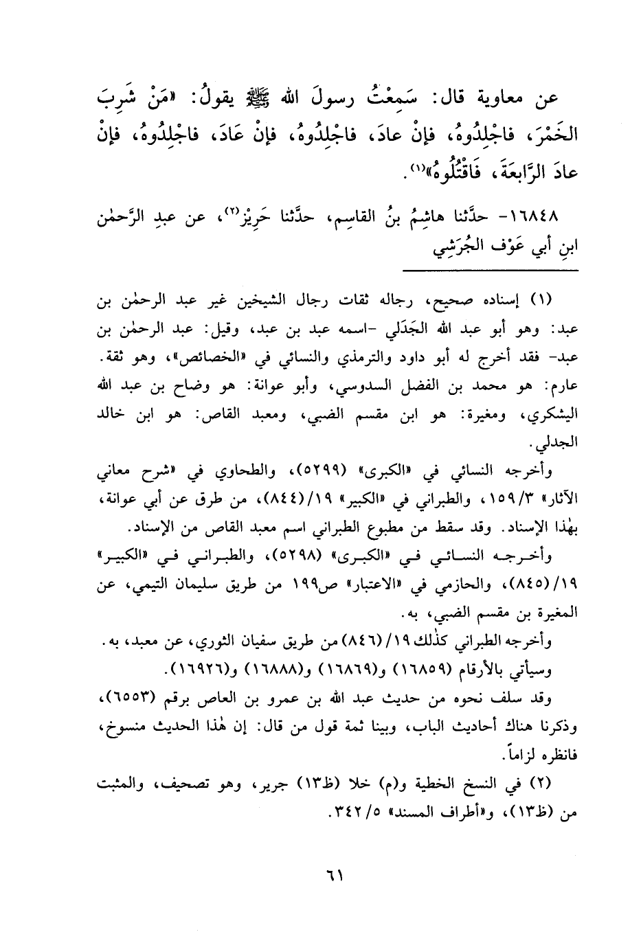 عَنْ مُعَاوِيَةَ، قَالَ: سَمِعْتُ رَسُولَ اللهِ صَلَّى اللهُ عَلَيْهِ وَسَلَّمَ يَقُولُ: " مَنْ شَرِبَ الْخَمْرَ فَاجْلِدُوهُ، فَإِنْ عَادَ، فَاجْلِدُوهُ، فَإِنْ عَادَ، فَاجْلِدُوهُ، فَإِنْ عَادَ الرَّابِعَةَ، فَاقْتُلُوهُ " (١)