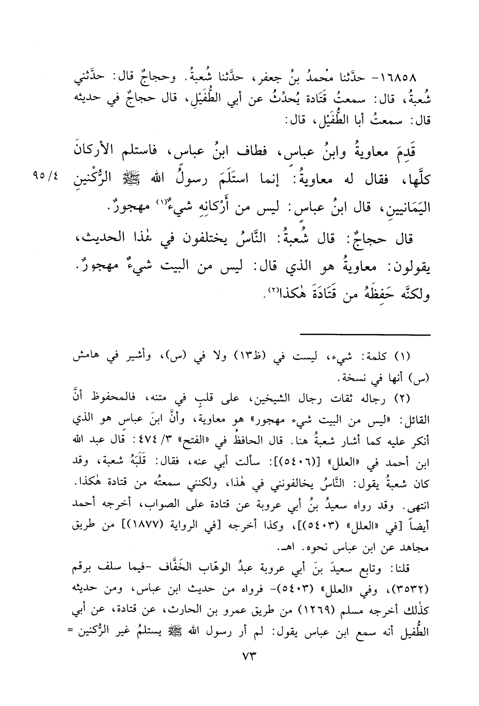 ١٦٨٥٨ - حَدَّثَنَا مُحَمَّدُ بْنُ جَعْفَرٍ، حَدَّثَنَا شُعْبَةُ، وَحَجَّاجٌ، قَالَ: حَدَّثَنِي شُعْبَةُ، قَالَ: سَمِعْتُ قَتَادَةَ، يُحَدِّثُ، عَنْ أَبِي الطُّفَيْلِ، قَالَ حَجَّاجٌ فِي حَدِيثِهِ، قَالَ: سَمِعْتُ أَبَا الطُّفَيْلِ، قَالَ: قَدِمَ مُعَاوِيَةُ وَابْنُ عَبَّاسٍ، فَطَافَ ابْنُ عَبَّاسٍ، فَاسْتَلَمَ الْأَرْكَانَ كُلَّهَا، فَقَالَ لَهُ مُعَاوِيَةُ: " إِنَّمَا اسْتَلَمَ رَسُولُ اللهِ صَلَّى اللهُ عَلَيْهِ وَسَلَّمَ الرُّكْنَيْنِ الْيَمَانِيَّيْنِ " قَالَ ابْنُ عَبَّاسٍ: " لَيْسَ مِنْ أَرْكَانِهِ شَيْءٌ (١) مَهْجُورٌ " قَالَ حَجَّاجٌ: قَالَ شُعْبَةُ: " النَّاسُ يَخْتَلِفُونَ فِي هَذَا الْحَدِيثِ، يَقُولُونَ: مُعَاوِيَةُ هُوَ الَّذِي قَالَ: لَيْسَ مِنَ الْبَيْتِ شَيْءٌ مَهْجُورٌ، وَلَكِنَّهُ حَفِظَهُ مِنْ قَتَادَةَ هَكَذَا " (٢)