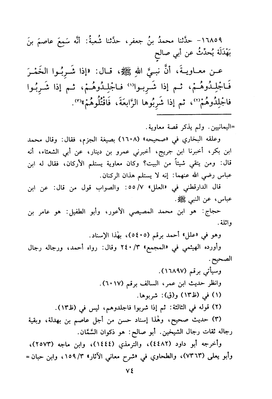 ١٦٨٥٩ - حَدَّثَنَا مُحَمَّدُ بْنُ جَعْفَرٍ، حَدَّثَنَا شُعْبَةُ، أَنَّهُ سَمِعَ عَاصِمَ ابْنَ بَهْدَلَةَ، يُحَدِّثُ عَنْ أَبِي صَالِحٍ، عَنْ مُعَاوِيَةَ، أَنَّ نَبِيَّ اللهِ صَلَّى اللهُ عَلَيْهِ وَسَلَّمَ قَالَ: " إِذَا شَرِبُوا الْخَمْرَ فَاجْلِدُوهُمْ، ثُمَّ إِذَا شَرِبُوا (١) فَاجْلِدُوهُمْ، ثُمَّ إِذَا شَرِبُوا فَاجْلِدُوهُمْ (٢) ، ثُمَّ إِذَا شَرِبُوهَا الرَّابِعَةَ، فَاقْتُلُوهُمْ " (٣)