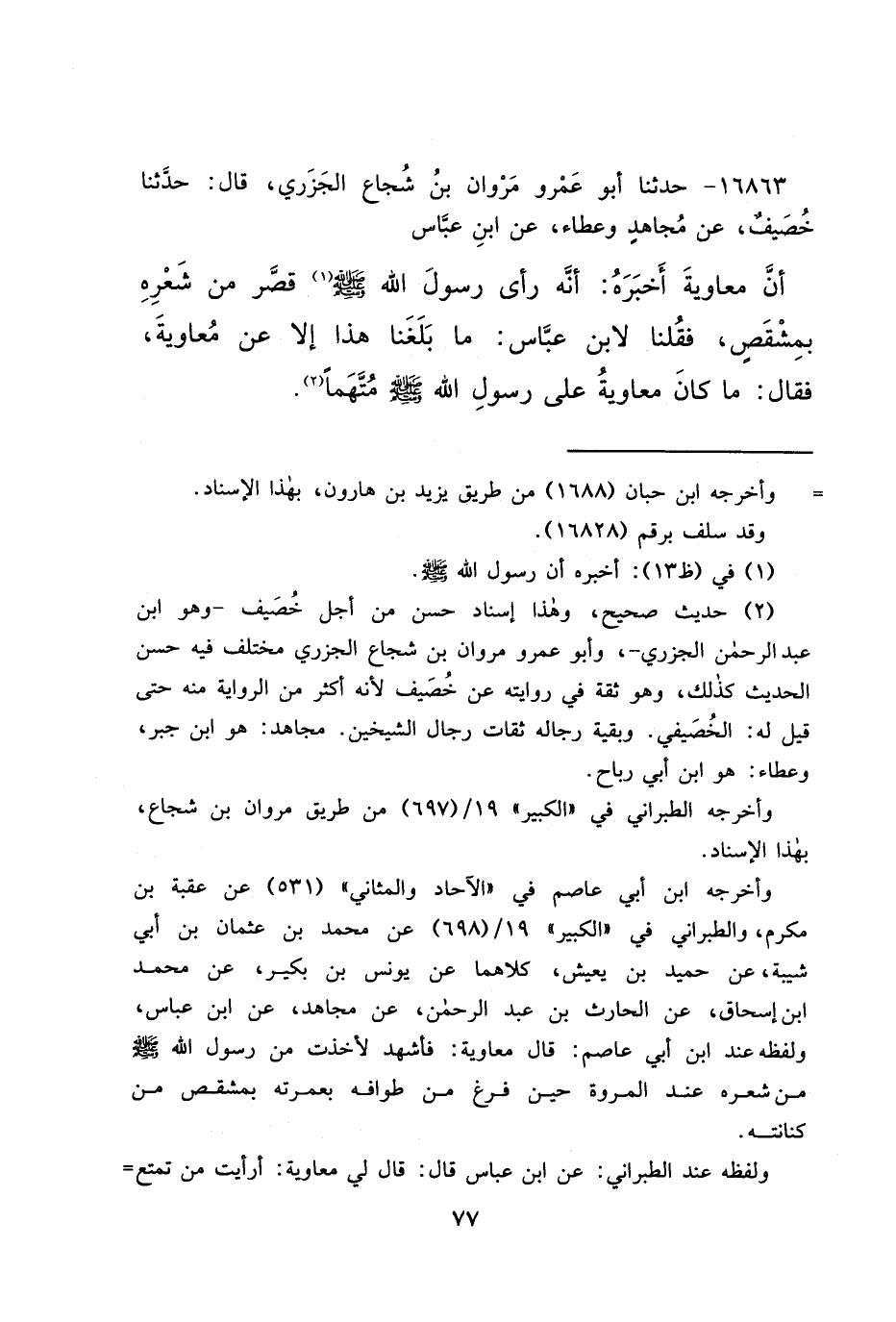 ١٦٨٦٣ - حَدَّثَنَا أَبُو عَمْرٍو مَرْوَانُ بْنُ شُجَاعٍ الْجَزَرِيُّ، قَالَ: حَدَّثَنَا خُصَيْفٌ، عَنْ مُجَاهِدٍ، وَعَطَاءٍ، عَنِ ابْنِ عَبَّاسٍ، أَنَّ مُعَاوِيَةَ، أخْبَرَهُ: أَنَّهُ رَأَى رَسُولَ اللهِ صَلَّى اللهُ عَلَيْهِ وَسَلَّمَ (١) " قَصَّرَ مِنْ شَعَرِهِ بِمِشْقَصٍ " فَقُلْنَا لِابْنِ عَبَّاسٍ: مَا بَلَغَنَا هَذَا إِلَّا عَنْ مُعَاوِيَةَ، فَقَالَ: " مَا كَانَ مُعَاوِيَةُ عَلَى رَسُولِ اللهِ صَلَّى اللهُ عَلَيْهِ وَسَلَّمَ مُتَّهَمًا " (٢)
