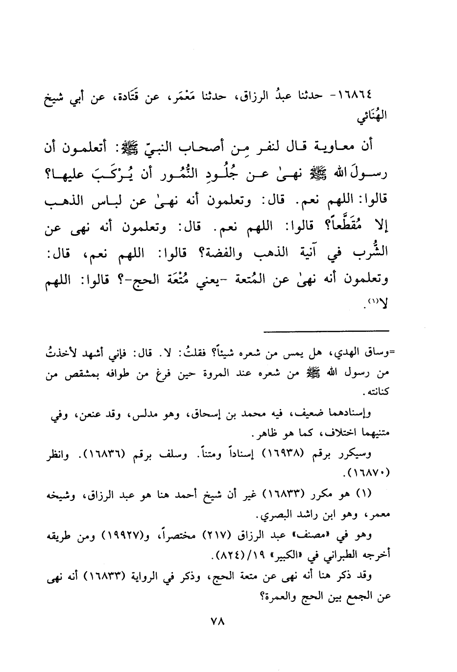 ١٦٨٦٤ - حَدَّثَنَا عَبْدُ الرَّزَّاقِ، حَدَّثَنَا مَعْمَرٌ، عَنْ قَتَادَةَ، عَنْ أَبِي شَيْخٍ الْهُنَائِيِّ، أَنَّ مُعَاوِيَةَ، قَالَ لِنَفَرٍ مِنْ أَصْحَابِ النَّبِيِّ صَلَّى اللهُ عَلَيْهِ وَسَلَّمَ: أَتَعْلَمُونَ أَنَّ رَسُولَ اللهِ صَلَّى اللهُ عَلَيْهِ وَسَلَّمَ " نَهَى عَنْ جُلُودِ النُّمُورِ أَنْ يُرْكَبَ عَلَيْهَا "؟ قَالُوا: اللهُمَّ نَعَمْ. قَالَ: وَتَعْلَمُونَ أَنَّهُ " نَهَى عَنْ لِبَاسِ الذَّهَبِ إِلَّا مُقَطَّعًا "؟ قَالُوا: اللهُمَّ نَعَمْ. قَالَ: وَتَعْلَمُونَ أَنَّهُ " نَهَى عَنِ الشُّرْبِ فِي آنِيَةِ الذَّهَبِ وَالْفِضَّةِ "؟ قَالُوا: اللهُمَّ نَعَمْ. قَالَ: وَتَعْلَمُونَ أَنَّهُ " نَهَى عَنِ الْمُتْعَةِ - يَعْنِي مُتْعَةَ الْحَجِّ - "؟ قَالُوا: اللهُمَّ لَا (١)