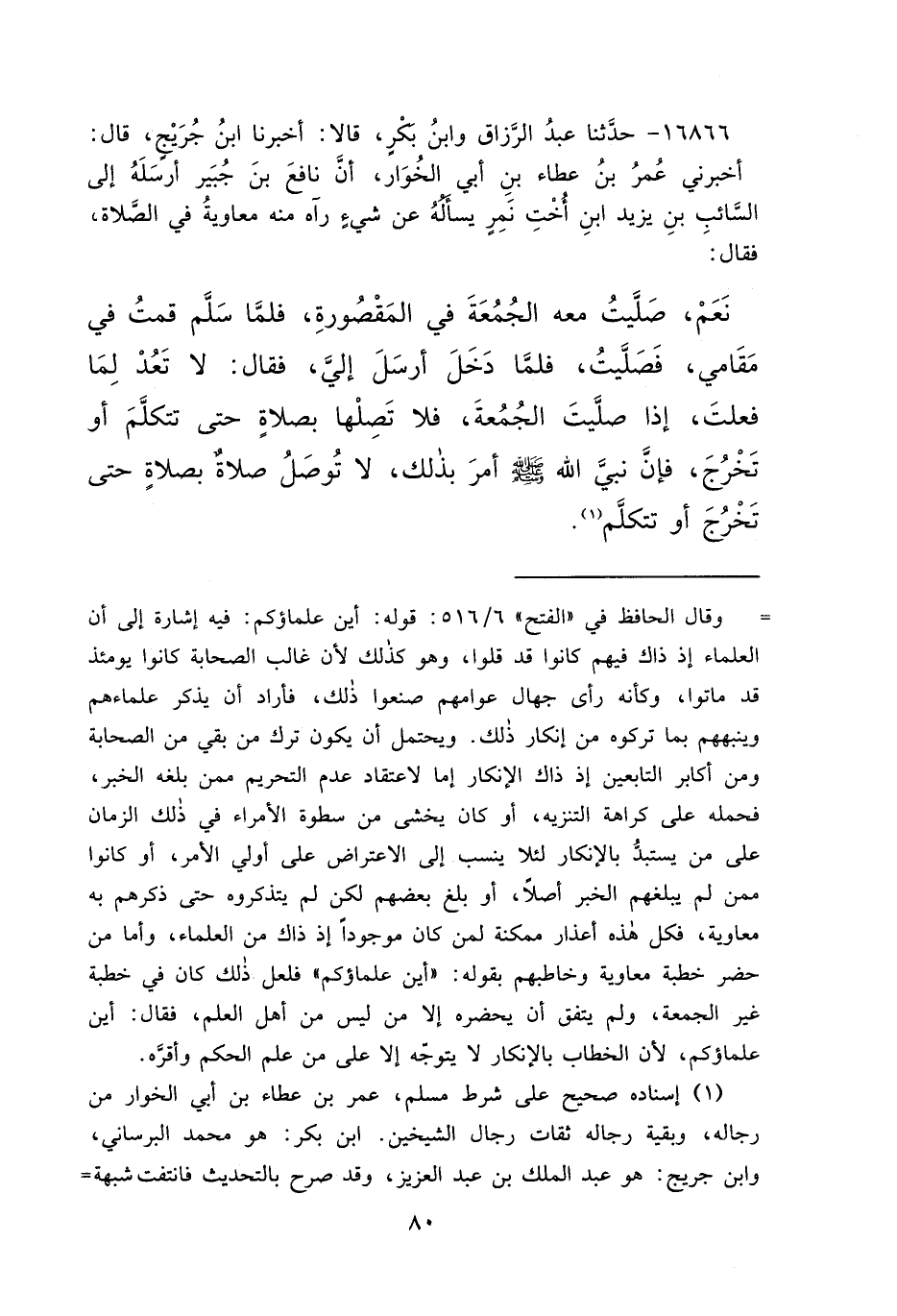 ١٦٨٦٦ - حَدَّثَنَا عَبْدُ الرَّزَّاقِ، وَابْنُ بَكْرٍ، قَالَا: أَخْبَرَنَا ابْنُ جُرَيْجٍ، قَالَ: أَخْبَرَنِي عُمَرُ بْنُ عَطَاءِ بْنِ أَبِي الْخُوَارِ، أَنَّ نَافِعَ بْنَ جُبَيْرٍ أَرْسَلَهُ إِلَى السَّائِبِ بْنِ يَزِيدَ، ابْنِ أُخْتِ نَمِرٍ يَسْأَلُهُ عَنْ شَيْءٍ رَآهُ مِنْهُ مُعَاوِيَةُ فِي الصَّلَاةِ، فَقَالَ: نَعَمْ، صَلَّيْتُ مَعَهُ الْجُمُعَةَ فِي الْمَقْصُورَةِ، فَلَمَّا سَلَّمَ قُمْتُ فِي مَقَامِي، فَصَلَّيْتُ، فَلَمَّا دَخَلَ أَرْسَلَ إِلَيَّ، فَقَالَ: لَا تَعُدْ لِمَا فَعَلْتَ، إِذَا صَلَّيْتَ الْجُمُعَةَ، فَلَا تَصِلْهَا بِصَلَاةٍ حَتَّى تَتَكَلَّمَ أَوْ تَخْرُجَ، فَإِنَّ نَبِيَّ اللهِ صَلَّى اللهُ عَلَيْهِ وَسَلَّمَ أَمَرَ بِذَلِكَ، " لَا تُوصَلُ صَلَاةً بِصَلَاةٍ حَتَّى تَخْرُجَ أَوْ تَتَكَلَّمَ " (١)