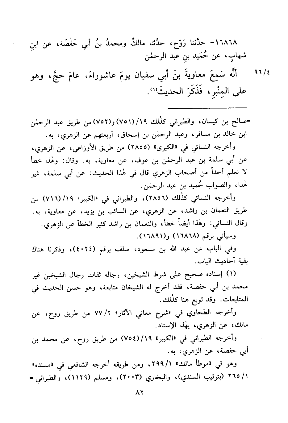 ١٦٨٦٨ - حَدَّثَنَا رَوْحٌ، حَدَّثَنَا مَالِكٌ، وَمُحَمَّدُ بْنُ أَبِي حَفْصَةَ، عَنِ ابْنِ شِهَابٍ، عَنْ حُمَيْدِ بْنِ عَبْدِ الرَّحْمَنِ، أَنَّهُ سَمِعَ مُعَاوِيَةَ بْنَ أَبِي سُفْيَانَ، يَوْمَ عَاشُورَاءَ، عَامَ حَجَّ، وَهُوَ عَلَى الْمِنْبَرِ، فَذَكَرَ الْحَدِيثَ (١)