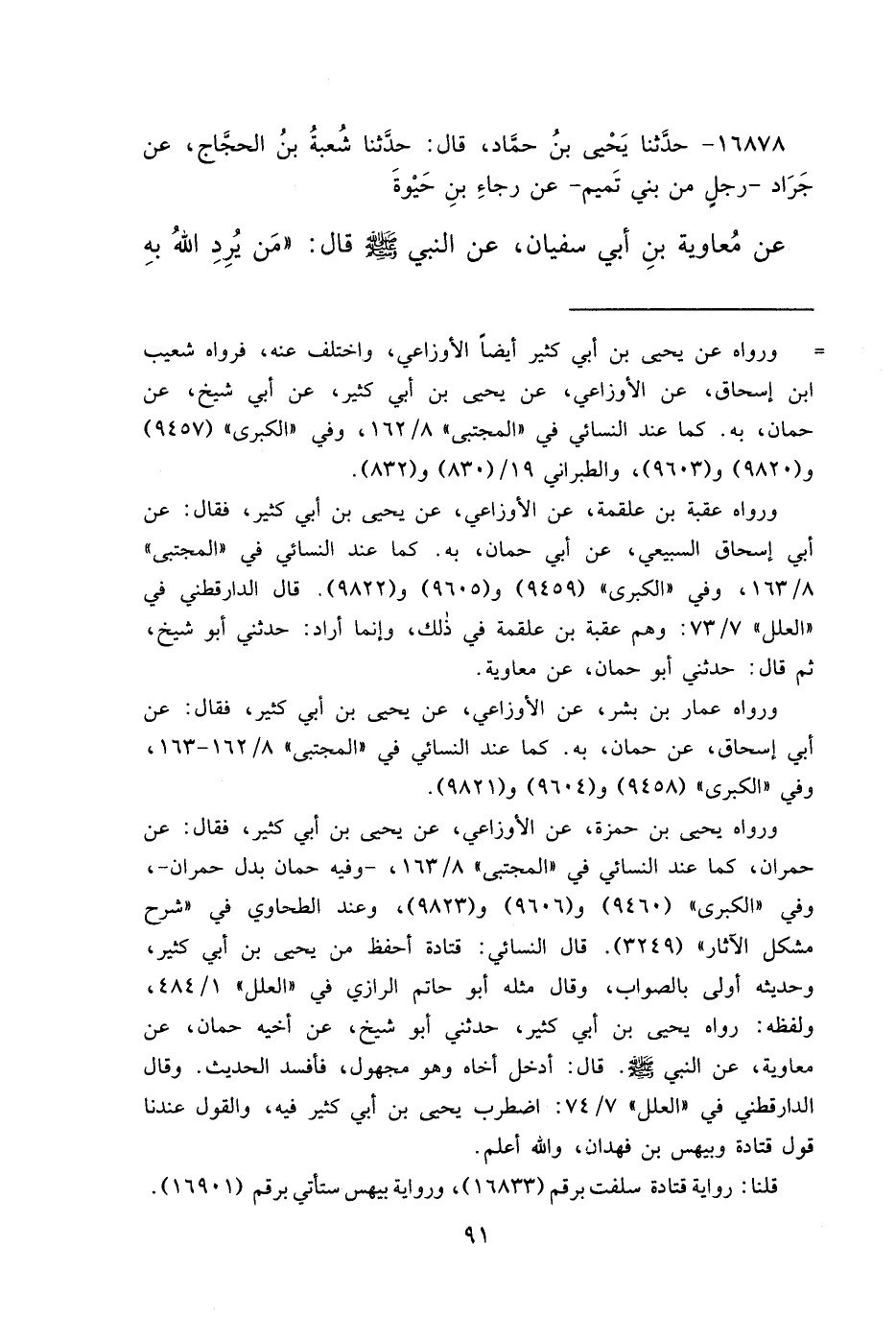 ورواه يحيى بن حمزة، عن الأوزاعي، عن يحيى بن أبي كثير، فقال: عن حمران، كما عند النسائي في "المجتبى" ٨/١٦٣،- وفيه حمان بدل حمران-، وفي "الكبرى" (٩٤٦٠) و (٩٦٠٦) و (٩٨٢٣) ، وعند الطحاوي في "شرح مشكل الآثار" (٣٢٤٩) . قال النسائي: قتادة أحفظ من يحيى بن أبي كثير، وحديثه أولى بالصواب، وقال مثله أبو حاتم الرازي في، العلل" ١/٤٨٤، ولفظه: رواه يحيى بن أبي كثير، حدثني أبو شيخ، عن أخيه حمان، عن معاوية، عن النبي صَلَّى اللهُ عَلَيْهِ وَسَلَّمَ. قال: أدخل أخاه وهو مجهول، فأفسد الحديث. وقال الدارقطني في "العلل" ٧/٧٤: اضطرب يحيى بن أبي كثير فيه، والقول عندنا قول قتادة وبيهس بن فهدان، والله أعلم.