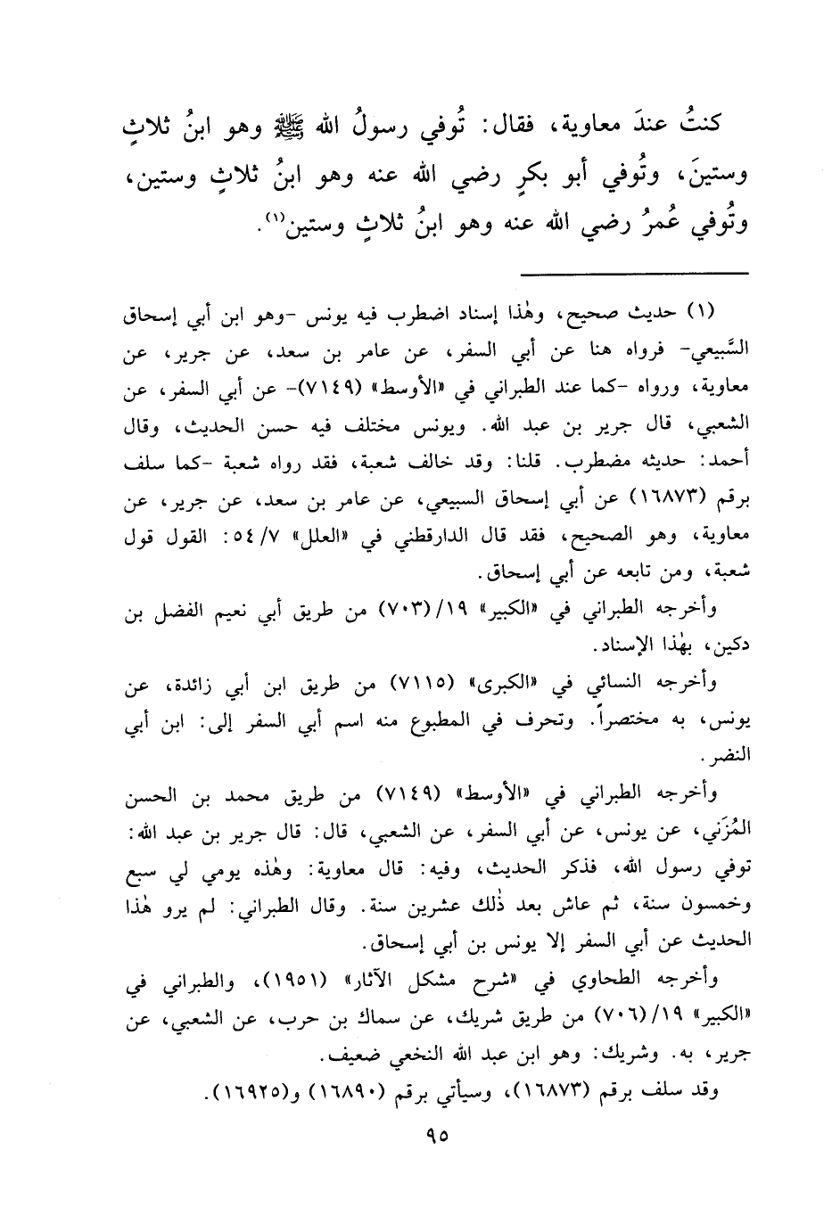 كُنْتُ عِنْدَ مُعَاوِيَةَ، فَقَالَ: " تُوُفِّيَ رَسُولُ اللهِ صَلَّى اللهُ عَلَيْهِ وَسَلَّمَ وَهُوَ ابْنُ ثَلَاثٍ وَسِتِّينَ " " وَتُوُفِّيَ أَبُو بَكْرٍ، رَضِيَ اللهُ عَنْهُ، وَهُوَ ابْنُ ثَلَاثٍ وَسِتِّينَ " " وَتُوُفِّيَ عُمَرُ،، رَضِيَ اللهُ عَنْهُ، وَهُوَ ابْنُ ثَلَاثٍ وَسِتِّينَ " (١)
