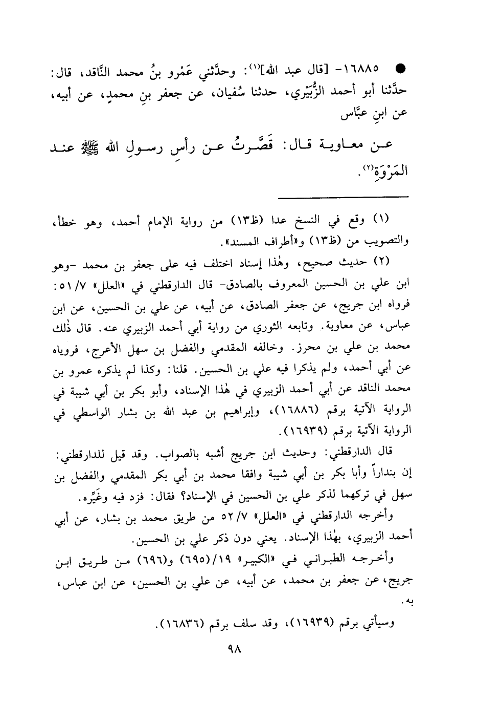 • ١٦٨٨٥ - قَالَ عَبْدُ اللهِ (١) ، وَحَدَّثَنِي عَمْرُو بْنُ مُحَمَّدٍ النَّاقِدُ، قَالَ: حَدَّثَنَا أَبُو أَحْمَدَ الزُّبَيْرِيُّ، حَدَّثَنَا سُفْيَانُ، عَنْ جَعْفَرِ بْنِ مُحَمَّدٍ، عَنْ أَبِيهِ، عَنِ ابْنِ عَبَّاسٍ، عَنْ مُعَاوِيَةَ، قَالَ: " قَصَّرْتُ عَنْ رَأْسِ رَسُولِ اللهِ صَلَّى اللهُ عَلَيْهِ وَسَلَّمَ عِنْدَ الْمَرْوَةِ " (٢)