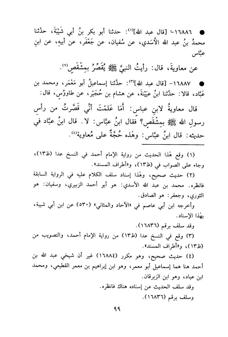 • ١٦٨٨٦ - قَالَ عَبْدُ اللهِ (١) : حَدَّثَنَا أَبُو بَكْرِ بْنُ أَبِي شَيْبَةَ، حَدَّثَنَا مُحَمَّدُ بْنُ عَبْدِ اللهِ الْأَسَدِيُّ، عَنْ سُفْيَانَ، عَنْ جَعْفَرٍ، عَنْ أَبِيهِ، عَنِ ابْنِ عَبَّاسٍ، عَنْ مُعَاوِيَةَ، قَالَ: رَأَيْتُ النَّبِيَّ صَلَّى اللهُ عَلَيْهِ وَسَلَّمَ " يُقَصِّرُ بِمِشْقَصٍ " (٢)