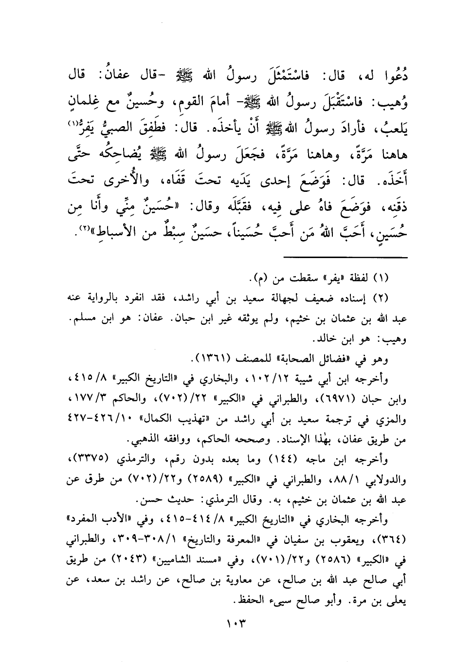 دُعُوا لَهُ، قَالَ: فَاسْتَمْثَلَ رَسُولُ اللهِ صَلَّى اللهُ عَلَيْهِ وَسَلَّمَ - قَالَ عَفَّانُ: قَالَ وُهَيْبٌ: فَاسْتَقْبَلَ رَسُولُ اللهِ صَلَّى اللهُ عَلَيْهِ وَسَلَّمَ - أَمَامَ الْقَوْمِ، وَحُسَيْنٌ مَعَ غِلْمَانٍ يَلْعَبُ، فَأَرَادَ رَسُولُ اللهِ صَلَّى اللهُ عَلَيْهِ وَسَلَّمَ أَنْ يَأْخُذَهُ. قَالَ: فَطَفِقَ الصَّبِيُّ يَفِرُّ (١) هَاهُنَا مَرَّةً، وَهَاهُنَا مَرَّةً، فَجَعَلَ رَسُولُ اللهِ صَلَّى اللهُ عَلَيْهِ وَسَلَّمَ يُضَاحِكُهُ حَتَّى أَخَذَهُ. قَالَ: فَوَضَعَ إِحْدَى يَدَيْهِ تَحْتَ قَفَاهُ، وَالْأُخْرَى تَحْتَ ذَقْنِهِ، فَوَضَعَ فَاهُ عَلَى فِيهِ، فَقَبَّلَهُ وَقَالَ: " حُسَيْنٌ مِنِّي وَأَنَا مِنْ حُسَيْنٍ، أَحَبَّ اللهُ مَنْ أَحَبَّ حُسَيْنًا، حُسَيْنٌ سِبْطٌ مِنَ الْأَسْبَاطِ " (٢)