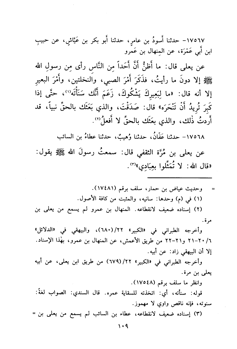 ١٧٥٦٧ - حَدَّثَنَا أَسْوَدُ بْنُ عَامِرٍ، حَدَّثَنَا أَبُو بَكْرِ بْنُ عَيَّاشٍ، عَنْ حَبِيبِ بْنِ أَبِي عَمْرَةَ، عَنْ الْمِنْهَالِ بْنِ عَمْرٍو، عَنْ يَعْلَى، قَالَ: مَا أَظُنُّ أَنَّ أَحَدًا مِنَ النَّاسِ رَأَى مِنْ رَسُولِ اللهِ صَلَّى اللهُ عَلَيْهِ وَسَلَّمَ إِلَّا دُونَ مَا رَأَيْتُ، فَذَكَرَ أَمْرَ الصَّبِيِّ، وَالنَّخْلَتَيْنِ، وَأَمْرَ الْبَعِيرِ، إِلَّا أَنَّهُ قَالَ: " مَا لِبَعِيرِكَ يَشْكُوكَ، زَعَمَ أَنَّكَ سَنأتهِ (١) ، حَتَّى إِذَا كَبُرَ تُرِيدُ أَنْ تَنْحَرَهُ " قَالَ: صَدَقْتَ، وَالَّذِي بَعَثَكَ بِالْحَقِّ نَبِيًّا، قَدْ أَرَدْتُ ذَلِكَ، وَالَّذِي بَعَثَكَ بِالْحَقِّ لَا أَفْعَلُ (٢)