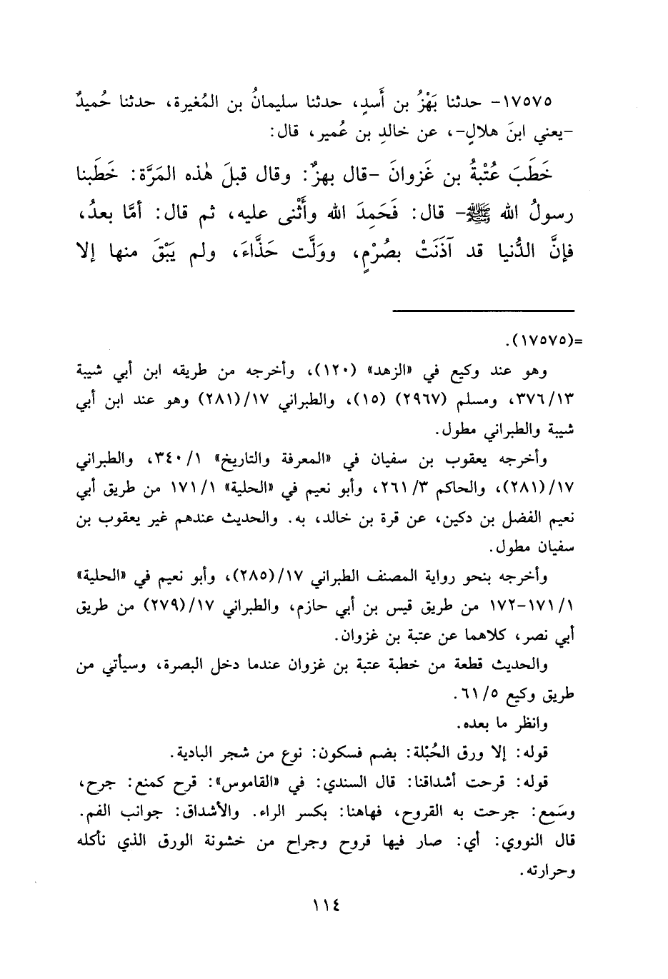 ١٧٥٧٥ - حَدَّثَنَا بَهْزُ بْنُ أَسَدٍ، حَدَّثَنَا سُلَيْمَانُ بْنُ الْمُغِيرَةِ، حَدَّثَنَا حُمَيْدٌ يَعْنِي ابْنَ هِلَالٍ، عَنْ خَالِدِ بْنِ عُمَيْرٍ، قَالَ: خَطَبَ عُتْبَةُ بْنُ غَزْوَانَ - قَالَ بَهْزٌ: وَقَالَ قَبْلَ هَذِهِ الْمَرَّةِ: خَطَبَنَا رَسُولُ اللهِ صَلَّى اللهُ عَلَيْهِ وَسَلَّمَ -، قَالَ: فَحَمِدَ اللهَ وَأَثْنَى عَلَيْهِ، ثُمَّ قَالَ:: أَمَّا بَعْدُ، فَإِنَّ الدُّنْيَا قَدْ آذَنَتْ بِصَرْمٍ، وَوَلَّتْ حَذَّاءَ، وَلَمْ يَبْقَ مِنْهَا إِلَّا