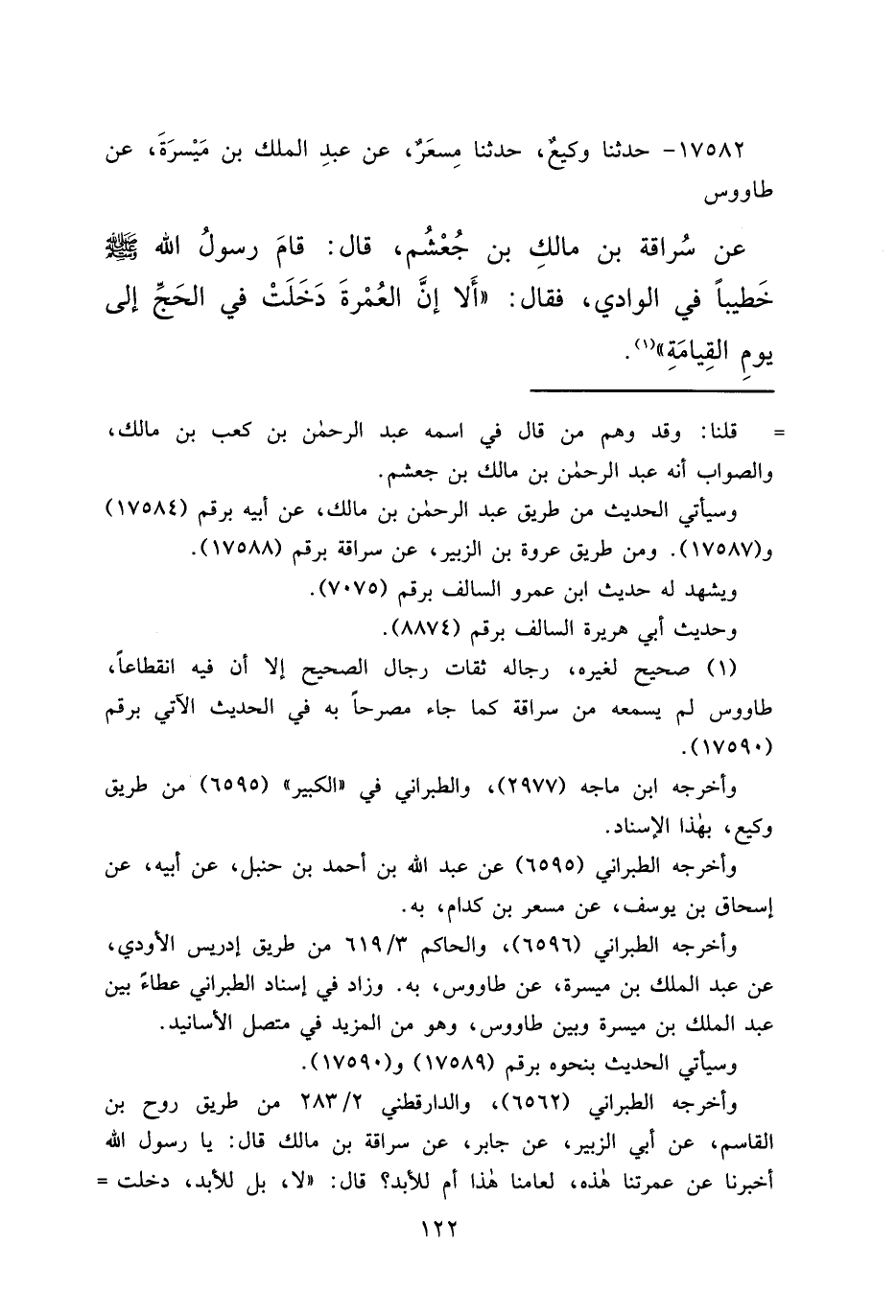 ١٧٥٨٢ - حَدَّثَنَا وَكِيعٌ، حَدَّثَنَا مِسْعَرٌ، عَنْ عَبْدِ الْمَلِكِ بْنِ مَيْسَرَةَ، عَنْ طَاوُسٍ، عَنْ سُرَاقَةَ بْنِ مَالِكِ بْنِ جُعْشُمٍ، قَالَ: قَامَ رَسُولُ اللهِ صَلَّى اللهُ عَلَيْهِ وَسَلَّمَ خَطِيبًا فِي الْوَادِي، فَقَالَ: " أَلَا إِنَّ الْعُمْرَةَ دَخَلَتْ فِي الْحَجِّ إِلَى يَوْمِ الْقِيَامَةِ " (١)