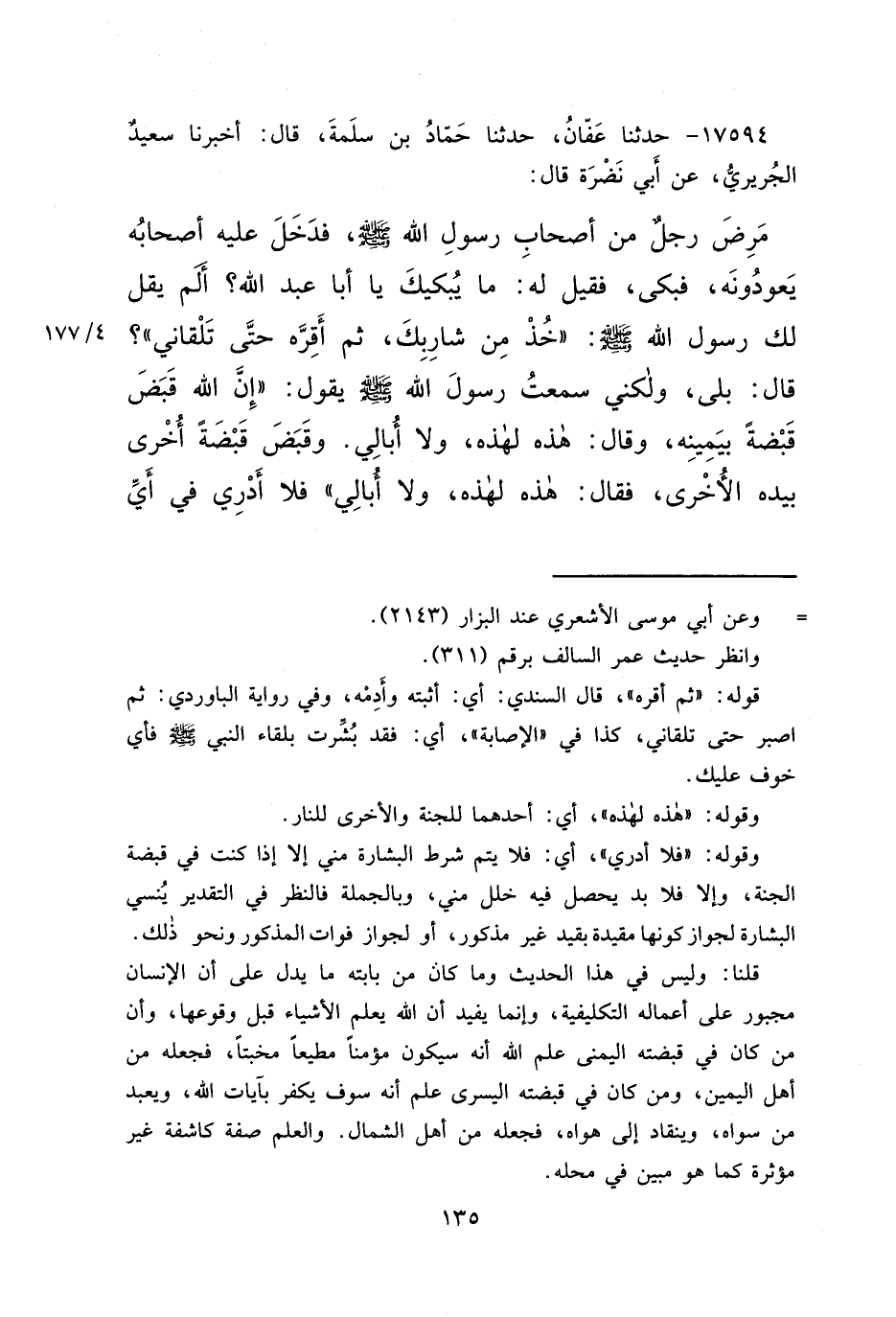 ١٧٥٩٤ - حَدَّثَنَا عَفَّانُ، حَدَّثَنَا حَمَّادُ بْنُ سَلَمَةَ، قَالَ: أَخْبَرَنَا سَعِيدٌ الْجُرَيْرِيُّ، عَنْ أَبِي نَضْرَةَ، قَالَ: مَرِضَ رَجُلٌ مِنْ أَصْحَابِ رَسُولِ اللهِ صَلَّى اللهُ عَلَيْهِ وَسَلَّمَ، فَدَخَلَ عَلَيْهِ أَصْحَابُهُ يَعُودُونَهُ، فَبَكَى، فَقِيلَ لَهُ: مَا يُبْكِيكَ يَا أَبَا عَبْدِ اللهِ؟ أَلَمْ يَقُلْ لَكَ رَسُولُ اللهِ صَلَّى اللهُ عَلَيْهِ وَسَلَّمَ: " خُذْ مِنْ شَارِبِكَ، ثُمَّ أَقِرَّهُ حَتَّى تَلْقَانِي "؟ قَالَ: بَلَى، وَلَكِنِّي سَمِعْتُ رَسُولَ اللهِ صَلَّى اللهُ عَلَيْهِ وَسَلَّمَ يَقُولُ: " إِنَّ اللهَ قَبَضَ قَبْضَةً بِمِينِيَهِ، وَقَالَ: هَذِهِ لِهَذِهِ، وَلَا أُبَالِي. وَقَبَضَ قَبْضَةً أُخْرَى بِيَدِهِ الْأُخْرَى، فَقَالَ: هَذِهِ لِهَذِهِ، وَلَا أُبَالِي " فَلَا أَدْرِي فِي أَيِّ