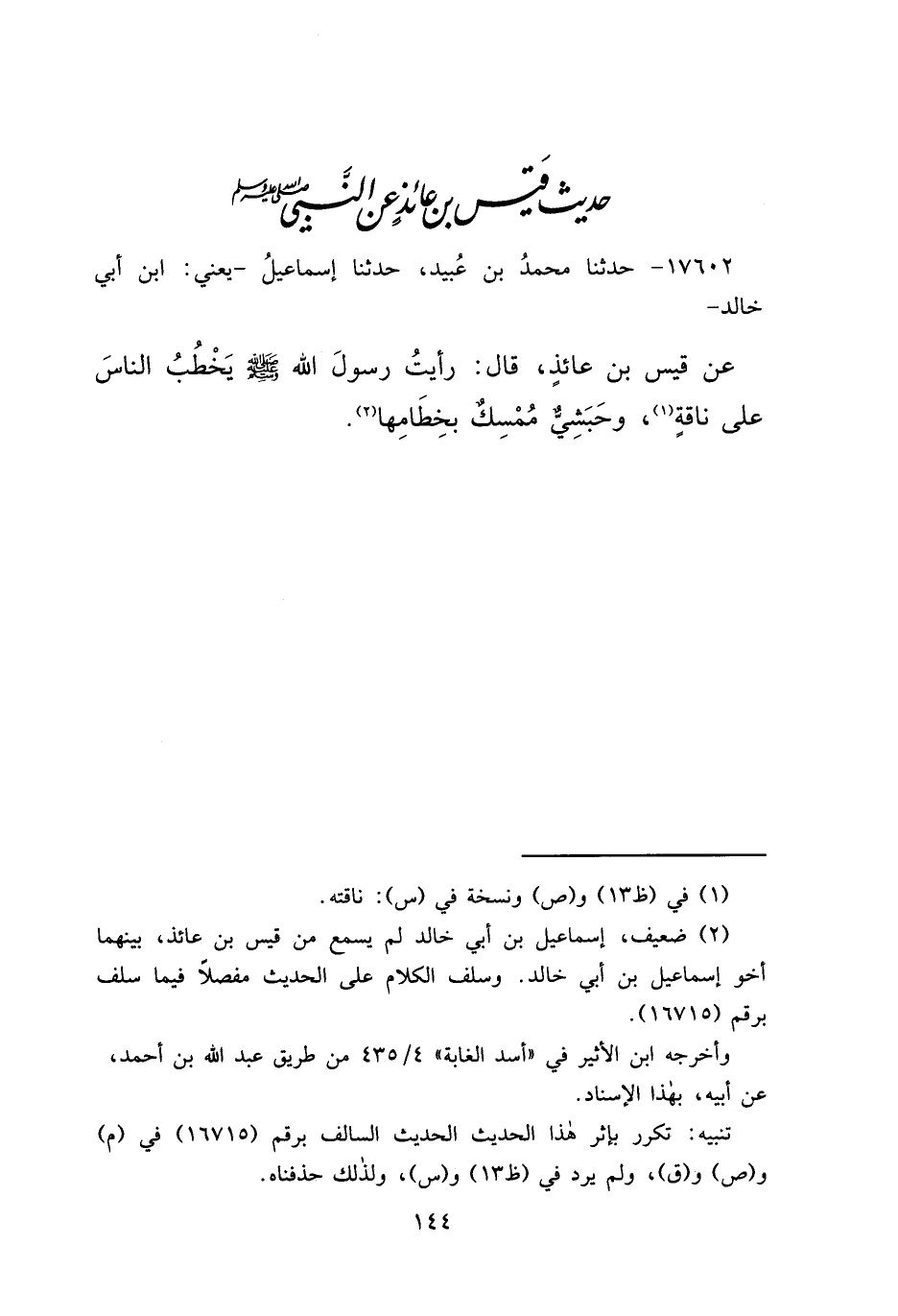 ١٧٦٠٢ - حَدَّثَنَا مُحَمَّدُ بْنُ عُبَيْدٍ، حَدَّثَنَا إِسْمَاعِيلُ يَعْنِي ابْنَ أَبِي خَالِدٍ، عَنْ قَيْسِ بْنِ عَائِذٍ، قَالَ: " رَأَيْتُ رَسُولَ اللهِ صَلَّى اللهُ عَلَيْهِ وَسَلَّمَ يَخْطُبُ النَّاسَ عَلَى نَاقَةٍ (١) ، وَحَبَشِيٌّ مُمْسِكٌ بِخِطَامِهَا " (٢)