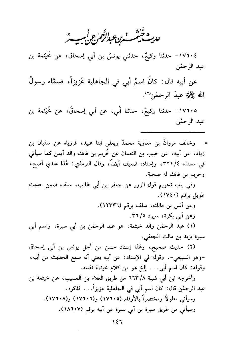 (٢) حديث صحيح، وهذا إسناد حسن من أجل يونس بن أبي إسحاق - وهو السبيعي-. وقوله في الإسناد: عن أبيه يعني أنه سمع الحديث من أبيه، وقوله: كان اسم أبي ... إلخ هو من كلام خيثمة نفسه.