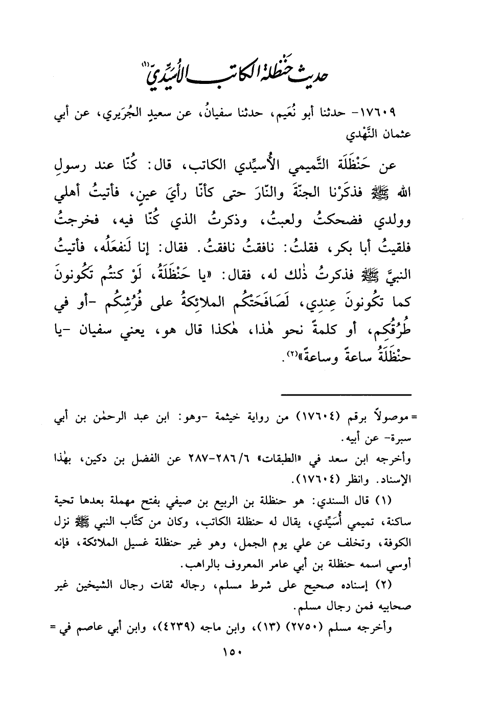 ١٧٦٠٩ - حَدَّثَنَا أَبُو نُعَيْمٍ، حَدَّثَنَا سُفْيَانُ، عَنْ سَعِيدٍ الْجُرَيْرِيِّ، عَنْ أَبِي عُثْمَانَ النَّهْدِيِّ، عَنْ حَنْظَلَةَ التَّمِيمِيِّ الْأُسَيْدِيِّ الْكَاتِبِ، قَالَ: كُنَّا عِنْدَ رَسُولِ اللهِ صَلَّى اللهُ عَلَيْهِ وَسَلَّمَ فَذَكَرْنَا الْجَنَّةَ وَالنَّارَ حَتَّى كَأَنَّا رَأْيَ عَيْنٍ، فَأَتَيْتُ أَهْلِي وَوَلَدِي فَضَحِكْتُ وَلَعِبْتُ، وَذَكَرْتُ الَّذِي كُنَّا فِيهِ، فَخَرَجْتُ فَلَقِيتُ أَبَا بَكْرٍ، فَقُلْتُ: نَافَقْتُ نَافَقْتُ. فَقَالَ: إِنَّا لَنَفْعَلُهُ، فَأَتَيْتُ النَّبِيَّ صَلَّى اللهُ عَلَيْهِ وَسَلَّمَ فَذَكَرْتُ ذَلِكَ لَهُ، فَقَالَ: " يَا حَنْظَلَةُ، لَوْ كُنْتُمْ تَكُونُونَ كَمَا تَكُونُونَ عِنْدِي، لَصَافَحَتْكُمُ الْمَلَائِكَةُ عَلَى فُرُشِكُمْ - أَوْ فِي طُرُقِكُمْ، أَوْ كَلِمَةً نَحْوَ هَذَا، هَكَذَا قَالَ هُوَ، يَعْنِي سُفْيَانَ - يَا حَنْظَلَةُ سَاعَةً وَسَاعَةً " (٢)