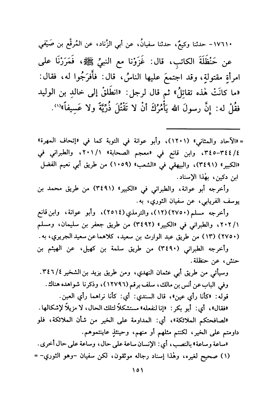 ١٧٦١٠ - حَدَّثَنَا وَكِيعٌ، حَدَّثَنَا سُفْيَانُ، عَنْ أَبِي الزِّنَادِ، عَنْ الْمُرَقَّعِ بْنِ صَيْفِيِّ، عَنْ حَنْظَلَةَ الْكَاتِبِ، قَالَ: غَزَوْنَا مَعَ النَّبِيِّ صَلَّى اللهُ عَلَيْهِ وَسَلَّمَ، فَمَرَرْنَا عَلَى امْرَأَةٍ مَقْتُولَةٍ، وَقَدِ اجْتَمَعَ عَلَيْهَا النَّاسُ، قَالَ: فَأَفْرَجُوا لَهُ، فَقَالَ: " مَا كَانَتْ هَذِهِ تُقَاتَلُ " ثُمَّ قَالَ لِرَجُلٍ: " انْطَلِقْ إِلَى خَالِدِ بْنِ الْوَلِيدِ فَقُلْ لَهُ: إِنَّ رَسُولَ اللهِ صَلَّى اللهُ عَلَيْهِ وَسَلَّمَ يَأْمُرُكَ أَنْ لَا تَقْتُلَ ذُرِّيَّةً وَلَا عَسِيفًا " (١)