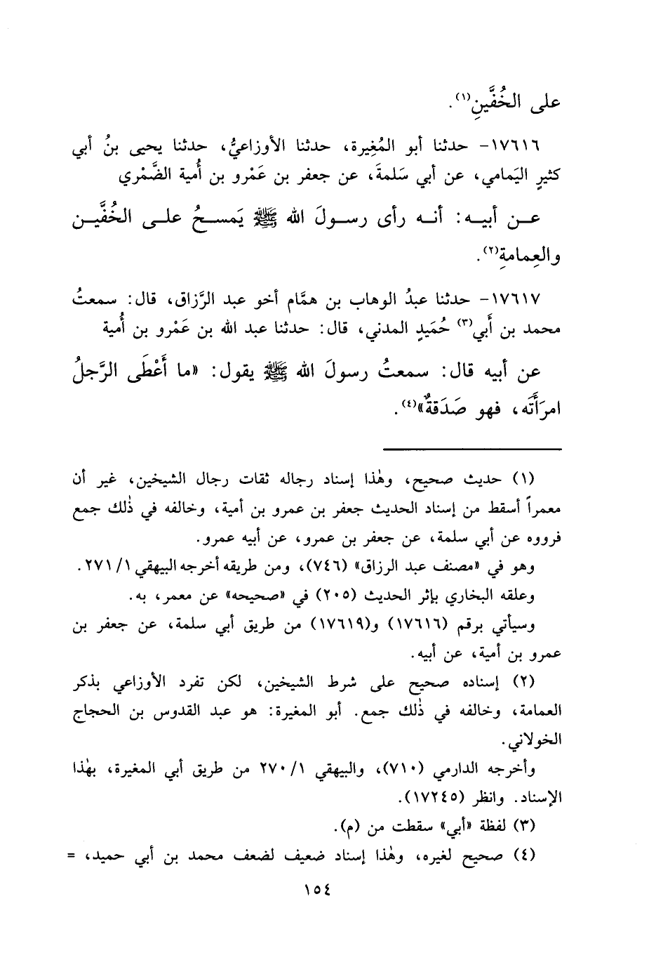 ١٧٦١٦ - حَدَّثَنَا أَبُو الْمُغِيرَةِ، حَدَّثَنَا الْأَوْزَاعِيُّ، حَدَّثَنَا يَحْيَى بْنُ أَبِي كَثِيرٍ الْيَمَامِيُّ، عَنْ أَبِي سَلَمَةَ، عَنْ جَعْفَرِ بْنِ عَمْرِو بْنِ أُمَيَّةَ الضَّمْرِيِّ، عَنْ أَبِيهِ: أَنَّهُ " رَأَى رَسُولَ اللهِ صَلَّى اللهُ عَلَيْهِ وَسَلَّمَ يَمْسَحُ عَلَى الْخُفَّيْنِ وَالْعِمَامَةِ " (٢)