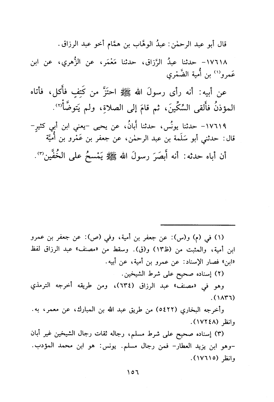 ١٧٦١٨ - حَدَّثَنَا عَبْدُ الرَّزَّاقِ، حَدَّثَنَا مَعْمَرٌ، عَنْ الزُّهْرِيِّ، عَنْ ابْنِ عَمْرٍو (١) بْنِ أُمَيَّةَ الضَّمْرِيِّ، عَنْ أَبِيهِ: أَنَّهُ " رَأَى رَسُولَ اللهِ صَلَّى اللهُ عَلَيْهِ وَسَلَّمَ احْتَزَّ مِنْ كَتِفٍ فَأَكَلَ، فَأَتَاهُ الْمُؤَذِّنُ فَأَلْقَى السِّكِّينَ، ثُمَّ قَامَ إِلَى الصَّلَاةِ، وَلَمْ يَتَوَضَّأْ " (٢)