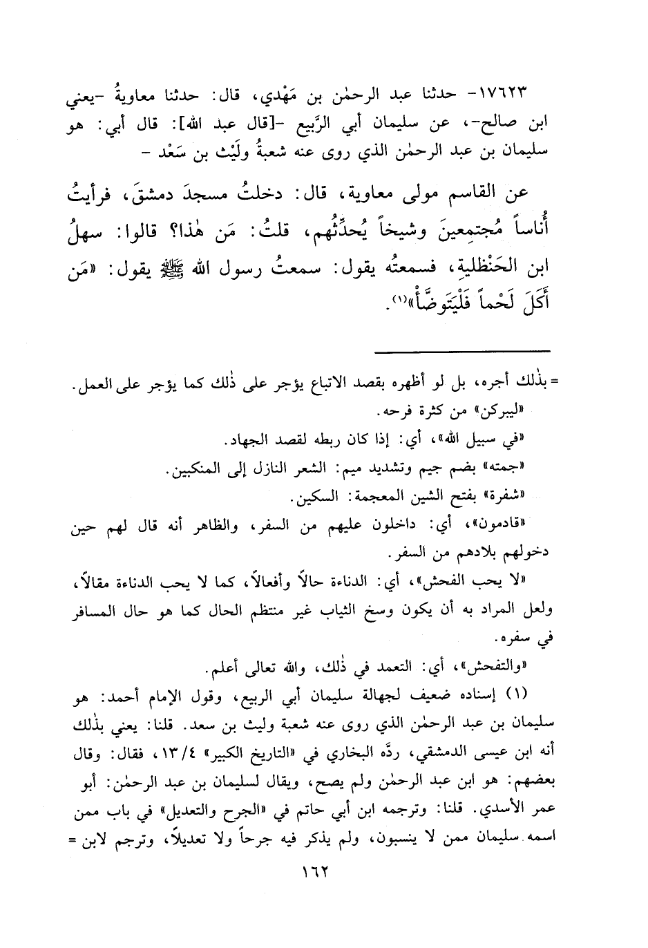 ١٧٦٢٣ - حَدَّثَنَا عَبْدُ الرَّحْمَنِ بْنُ مَهْدِيٍّ، قَالَ: حَدَّثَنَا مُعَاوِيَةُ يَعْنِي ابْنَ صَالِحٍ، عَنْ سُلَيْمَانَ أَبِي الرَّبِيعِ - قَالَ عَبْدُ اللهِ قَالَ أَبِي:: " هُوَ سُلَيْمَانُ بْنُ عَبْدِ الرَّحْمَنِ الَّذِي رَوَى عَنْهُ، شُعْبَةُ وَلَيْثُ بْنُ سَعْدٍ " - عَنْ الْقَاسِمِ، مَوْلَى مُعَاوِيَةَ، قَالَ: دَخَلْتُ مَسْجِدَ دِمَشْقَ، فَرَأَيْتُ أُنَاسًا مُجْتَمِعِينَ وَشَيْخًا يُحَدِّثُهُمْ، قُلْتُ: مَنْ هَذَا؟ قَالُوا: سَهْلُ ابْنُ الْحَنْظَلِيَّةِ فَسَمِعْتُهُ يَقُولُ: سَمِعْتُ رَسُولَ اللهِ صَلَّى اللهُ عَلَيْهِ وَسَلَّمَ يَقُولُ: " مَنْ أَكَلَ لَحْمًا فَلْيَتَوَضَّأْ " (١)