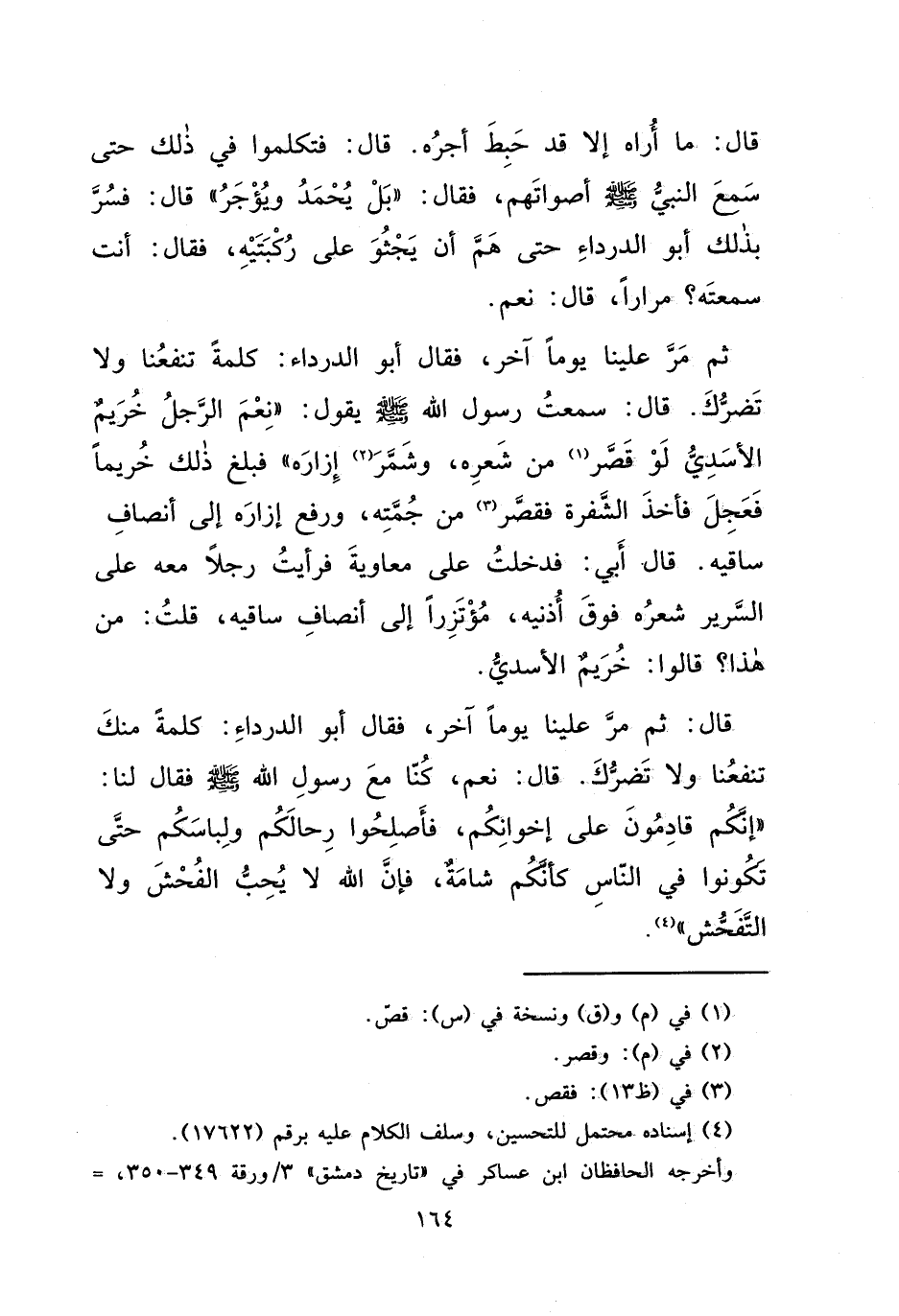 قَالَ: ثُمَّ مَرَّ عَلَيْنَا يَوْمًا آخَرَ، فَقَالَ أَبُو الدَّرْدَاءِ: كَلِمَةً مِنْكَ تَنْفَعُنَا وَلَا تَضُرُّكَ، قَالَ: نَعَمْ كُنَّا مَعَ رَسُولِ اللهِ صَلَّى اللهُ عَلَيْهِ وَسَلَّمَ، فَقَالَ لَنَا: " إِنَّكُمْ قَادِمُونَ عَلَى إِخْوَانِكُمْ، فَأَصْلِحُوا رِحَالَكُمْ، وَلِبَاسَكُمْ حَتَّى تَكُونُوا فِي النَّاسِ كَأَنَّكُمْ شَامَةٌ، فَإِنَّ اللهَ لَا يُحِبُّ الْفُحْشَ، وَلَا التَّفَحُّشَ (٤)