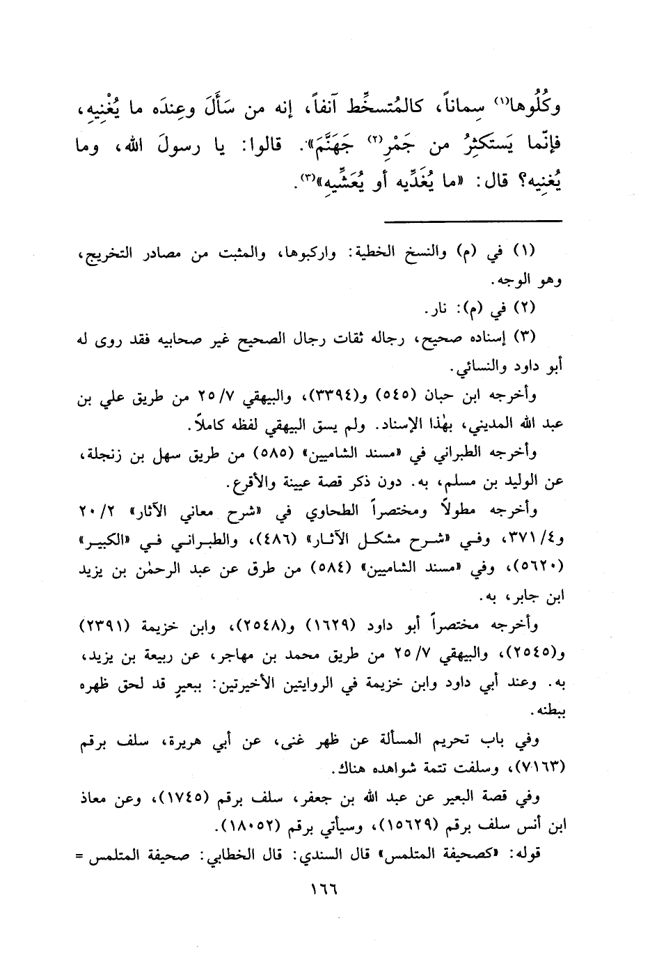 وَكُلُوهَا (١) سِمَانًا كَالْمُتَسَخِّطِ، آنِفًا، إِنَّهُ مَنْ سَأَلَ وَعِنْدَهُ مَا يُغْنِيهِ، فَإِنَّمَا يَسْتَكْثِرُ مِنْ جَمْرِ (٢) جَهَنَّمَ " قَالُوا: يَا رَسُولَ اللهِ صَلَّى اللهُ عَلَيْهِ وَسَلَّمَ، وَمَا يُغْنِيهِ؟ قَالَ: " مَا يُغَدِّيهِ أَوْ يُعَشِّيهِ " (٣)