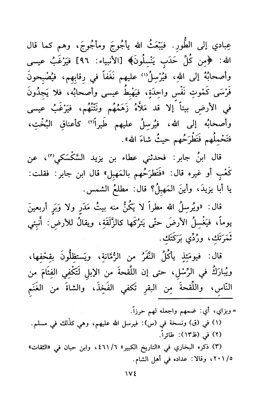 عِبَادِي إِلَى الطُّورِ، فَيَبْعَثُ اللهُ يَأْجُوجَ وَمَأْجُوجَ، وَهُمْ كَمَا قَالَ اللهُ: {مِنْ كُلِّ حَدَبٍ يَنْسِلُونَ} [الأنبياء: ٩٦] ، فَيَرْغَبُ عِيسَى وَأَصْحَابُهُ إِلَى اللهِ، فَيُرْسِلُ (١) عَلَيْهِمْ نَغَفًا فِي رِقَابِهِمْ، فَيُصْبِحُونَ فَرْسَى كَمَوْتِ نَفْسٍ وَاحِدَةٍ، فَيَهْبِطُ عِيسَى وَأَصْحَابُهُ، فَلَا يَجِدُونَ فِي الْأَرْضِ بَيْتًا إِلَّا قَدْ مَلَأَهُ زَهَمُهُمْ وَنَتِنُهُمْ، فَيَرْغَبُ عِيسَى وَأَصْحَابُهُ إِلَى اللهِ، فَيُرْسِلُ عَلَيْهِمْ طَيْرًا (٢) كَأَعْنَاقِ الْبُخْتِ، فَتَحْمِلُهُمْ فَتَطْرَحُهُمْ حَيْثُ شَاءَ اللهُ، قَالَ ابْنُ جَابِرٍ: فَحَدَّثَنِي يَزِيْدَ بْنُ عَطَاْءِ السَّكْسَكِيُّ (٣) ، عَنْ كَعْبٍ، أَوْ غَيْرِهِ قَالَ: " فَتَطْرَحُهُمْ بِالْمَهْبِلِ "، قَالَ ابْنُ جَابِرٍ، فَقُلْتُ: يَا أَبَا يَزِيدَ، وَأَيْنَ الْمَهْبِلُ؟ قَالَ: " مَطْلَعُ الشَّمْسِ "، قَالَ: " وَيُرْسِلُ اللهُ مَطَرًا لَا يَكُنْ مِنْهُ بَيْتُ، مَدَرٍ، وَلَا وَبَرٍ أَرْبَعِينَ يَوْمًا، فَيَغْسِلُ الْأَرْضَ حَتَّى يَتْرُكَهَا كَالزَّلَقَةِ، وَيُقَالُ لِلْأَرْضِ: أَنْبِتِي ثَمَرَتَكِ، وَرُدِّي بَرَكَتَكِ، قَالَ: فَيَوْمَئِذٍ يَأْكُلُ النَّفَرُ مِنَ الرُّمَّانَةِ، وَيَسْتَظِلُّونَ بِقِحْفِهَا، وَيُبَارَكُ فِي الرِّسْلِ، حَتَّى أَنَّ اللَّقْحَةَ مِنَ الْإِبِلِ لَتَكْفِي الْفِئَامَ مِنَ النَّاسِ، وَاللَّقْحَةَ مِنَ الْبَقَرِ تَكْفِي الْفَخِذَ وَالشَّاةَ مِنَ الْغَنَمِ،