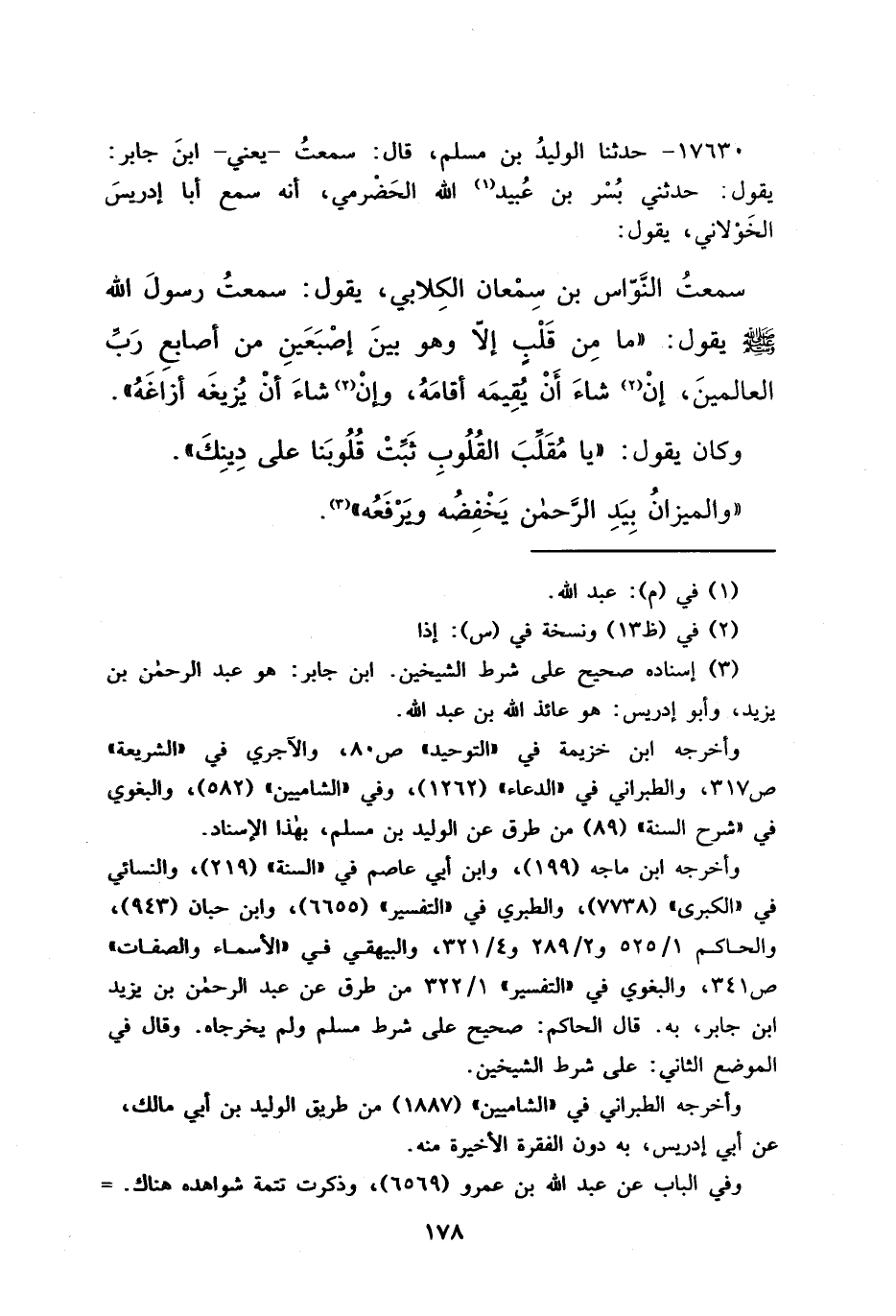 ١٧٦٣٠ - حَدَّثَنَا الْوَلِيدُ بْنُ مُسْلِمٍ، قَالَ: سَمِعْتُ يَعْنِي ابْنَ جَابِرٍ، يَقُولُ: حَدَّثَنِي بُسْرُ بْنُ عُبَيْدِ (١) اللهِ الْحَضْرَمِيُّ، أَنَّهُ سَمِعَ أَبَا إِدْرِيسَ الْخَوْلَانِيَّ، يَقُولُ: سَمِعْتُ النَّوَّاسَ بْنَ سَمْعَانَ الْكِلَابِيَّ يَقُولُ: سَمِعْتُ رَسُولَ اللهِ صَلَّى اللهُ عَلَيْهِ وَسَلَّمَ يَقُولُ: " مَا مِنْ قَلْبٍ إِلَّا وَهُوَ بَيْنَ أُصْبُعَيْنِ مِنْ أَصَابِعِ رَبِّ الْعَالَمِينَ، إِنْ شَاءَ أَنْ يُقِيمَهُ أَقَامَهُ، وَإِنْ (٢) شَاءَ أَنْ يُزِيغَهُ أَزَاغَهُ " وَكَانَ يَقُولُ: " يَا مُقَلِّبَ الْقُلُوبِ ثَبِّتْ قُلُوبَنَا عَلَى دِينِكَ، وَالْمِيزَانُ بِيَدِ الرَّحْمَنِ يَخْفِضُهُ وَيَرْفَعُهُ " (٣)