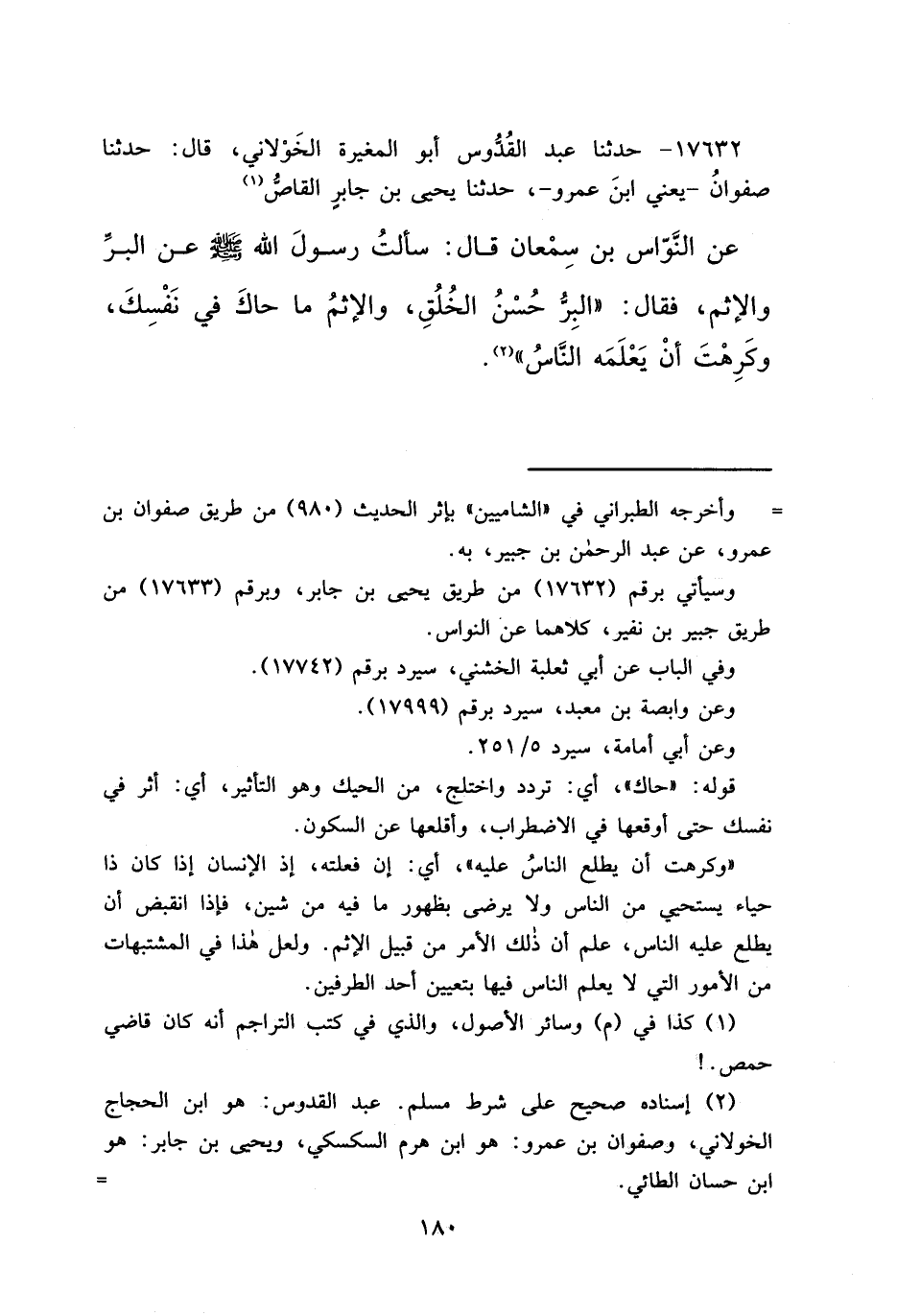 ١٧٦٣٢ - حَدَّثَنَا عَبْدُ الْقُدُّوسِ أَبُو الْمُغِيرَةِ الْخَوْلَانِيُّ، قَالَ: حَدَّثَنَا صَفْوَانُ يَعْنِي ابْنَ عَمْرٍو، حَدَّثَنَا يَحْيَى بْنُ جَابِرٍ القَّاصُّ (١) ، عَنْ النَّوَّاسِ بْنِ سَمْعَانَ، قَالَ: سَأَلْتُ رَسُولَ اللهِ صَلَّى اللهُ عَلَيْهِ وَسَلَّمَ عَنِ الْبِرِّ، وَالْإِثْمِ، فَقَالَ: " الْبِرُّ حُسْنُ الْخُلُقِ، وَالْإِثْمُ مَا حَاكَ فِي نَفْسِكَ، وَكَرِهْتَ أَنْ يَعْلَمَهُ النَّاسُ " (٢)