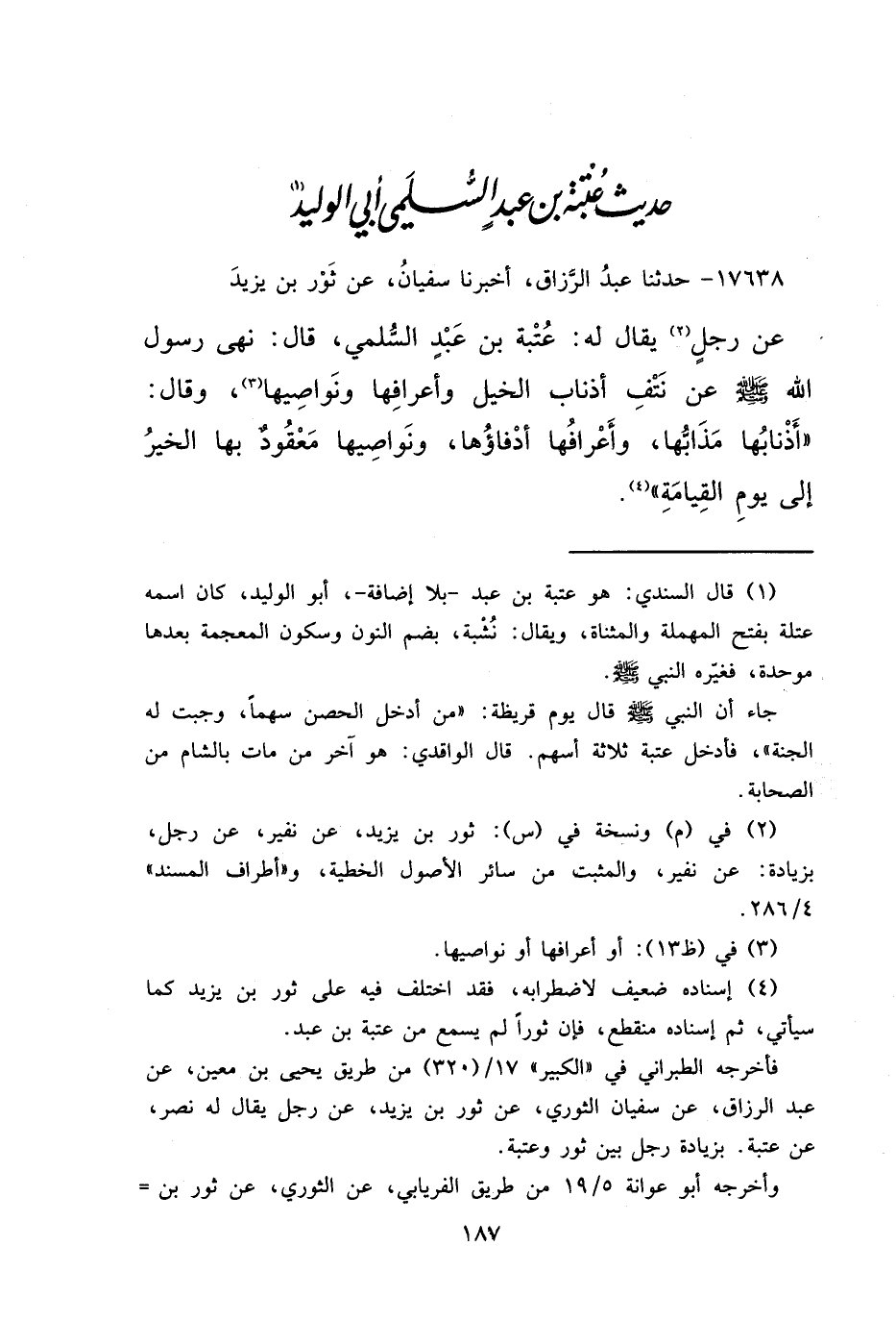 ١٧٦٣٨ - حَدَّثَنَا عَبْدُ الرَّزَّاقِ، أَخْبَرَنَا سُفْيَانُ، عَنْ ثَوْرِ بْنِ يَزِيدَ، عَنْ نَصْرٍ، عَنْ رَجُلٍ (٢) ، عَنْ عُتْبَةَ بْنِ عَبْدٍ السُّلَمِيِّ، قَالَ: " نَهَى رَسُولُ اللهِ صَلَّى اللهُ عَلَيْهِ وَسَلَّمَ عَنْ نَتْفِ أَذْنَابِ الْخَيْلِ وَأَعْرَافِهَا وَنَوَاصِيهَا (٣) "، وَقَالَ: " أَذْنَابُهَا مَذَابُّهَا، وَأَعْرَافُهَا إِدْفَاؤُهَا، وَنَوَاصِيهَا مَعْقُودٌ بِهَا الْخَيْرُ إِلَى يَوْمِ الْقِيَامَةِ (٤)