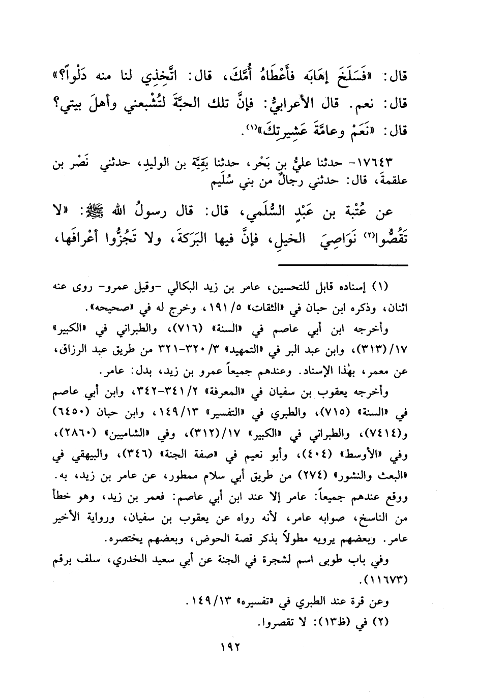 ١٧٦٤٣ - حَدَّثَنَا عَلِيُّ بْنُ بَحْرٍ، حَدَّثَنَا بَقِيَّةُ بْنُ الْوَلِيدِ، حَدَّثَنِي نَصْرُ بْنُ عَلْقَمَةَ، قَالَ: حَدَّثَنِي رِجَالٌٍ، مِنْ بَنِي سُلَيْمٍ، عَنْ عُتْبَةَ بْنِ عَبْدٍ السُّلَمِيِّ، قَالَ: قَالَ رَسُولُ اللهِ صَلَّى اللهُ عَلَيْهِ وَسَلَّمَ: " لَا تَقُصُّوا (٢) نَوَاصِيَ الْخَيْلِ، فَإِنَّ فِيهَا الْبَرَكَةَ، وَلَا تَجُزُّوا أَعْرَافَهَا