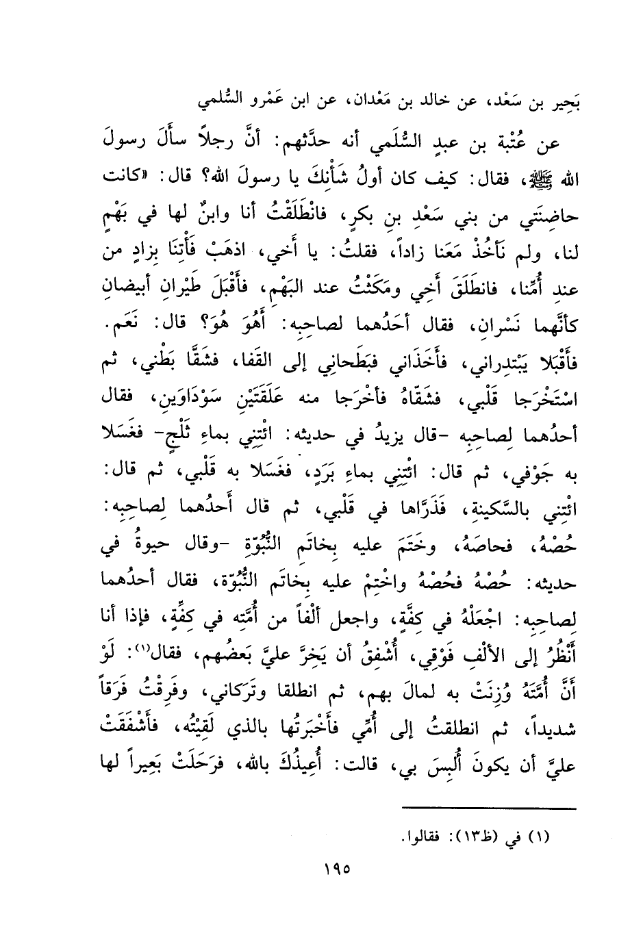 بَحِيرُ بْنُ سَعْدٍ، عَنْ خَالِدِ بْنِ مَعْدَانَ، عَنْ ابْنِ عَمْرٍو السُّلَمِيِّ، عَنْ عُتْبَةَ بْنِ عَبْدٍ السُّلَمِيِّ، أَنَّهُ حَدَّثَهُمْ: أَنَّ رَجُلًا سَأَلَ رَسُولَ اللهِ صَلَّى اللهُ عَلَيْهِ وَسَلَّمَ فَقَالَ: كَيْفَ كَانَ أَوَّلُ شَأْنِكَ يَا رَسُولَ اللهِ؟ قَالَ: " كَانَتْ حَاضِنَتِي مِنْ بَنِي سَعْدِ بْنِ بَكْرٍ، فَانْطَلَقْتُ أَنَا وَابْنٌ لَهَا فِي بَهْمٍ لَنَا، وَلَمْ نَأْخُذْ مَعَنَا زَادًا، فَقُلْتُ: يَا أَخِي، اذْهَبْ فَأْتِنَا بِزَادٍ مِنْ عِنْدِ أُمِّنَا، فَانْطَلَقَ أَخِي وَمَكَثْتُ عِنْدَ الْبَهْمِ، فَأَقْبَلَ طَيْرَانِ أَبْيَضَانِ كَأَنَّهُمَا نَسْرَانِ، فَقَالَ أَحَدُهُمَا لِصَاحِبِهِ: أَهُوَ هُوَ؟ قَالَ: نَعَمْ، فَأَقْبَلَا يَبْتَدِرَانِي، فَأَخَذَانِي فَبَطَحَانِي إِلَى الْقَفَا، فَشَقَّا بَطْنِي، ثُمَّ اسْتَخْرَجَا قَلْبِي، فَشَقَّاهُ فَأَخْرَجَا مِنْهُ عَلَقَتَيْنِ سَوْدَاوَيْنِ، فَقَالَ أَحَدُهُمَا لِصَاحِبِهِ: - قَالَ يَزِيدُ فِي حَدِيثِهِ، ائْتِنِي بِمَاءِ ثَلْجٍ - فَغَسَلَا بِهِ جَوْفِي، ثُمَّ قَالَ: ائْتِنِي بِمَاءِ بَرَدٍ فَغَسَلَا بِهِ قَلْبِي، ثُمَّ قَالَ: ائْتِنِي بِالسَّكِينَةِ فَذرَّاهَا فِي قَلْبِي، ثُمَّ قَالَ أَحَدُهُمَا لِصَاحِبِهِ: حِصْهُ، فَحَاصَهُ، وَخَتَمَ عَلَيْهِ بِخَاتَمِ النُّبُوَّةِ - وَقَالَ حَيْوَةُ: فِي حَدِيثِهِ حِصْهُ فَحَصَّهُ وَاخْتِمْ عَلَيْهِ بِخَاتَمِ النُّبُوَّةِ -، فَقَالَ أَحَدُهُمَا لِصَاحِبِهِ اجْعَلْهُ فِي كِفَّةٍ، وَاجْعَلْ أَلْفًا مِنْ أُمَّتِهِ فِي كِفَّةٍ، فَإِذَا أَنَا أَنْظُرُ إِلَى الْأَلْفِ فَوْقِي، أُشْفِقُ أَنْ يَخِرَّ عَلَيَّ بَعْضُهُمْ، فَقَالَ: (١) " لَوْ أَنَّ أُمَّتَهُ وُزِنَتْ بِهِ لَمَالَ بِهِمْ، ثُمَّ انْطَلَقَا وَتَرَكَانِي، وَفَرِقْتُ فَرَقًا شَدِيدًا، ثُمَّ انْطَلَقْتُ إِلَى أُمِّي فَأَخْبَرْتُهَا بِالَّذِي لَقِيتُهُ، فَأَشْفَقَتْ عَلَيَّ أَنْ يَكُونَ أُلْبِسَ بِي، قَالَتْ: أُعِيذُكَ بِاللهِ، فَرَحَلَتْ بَعِيرًا لَهَا