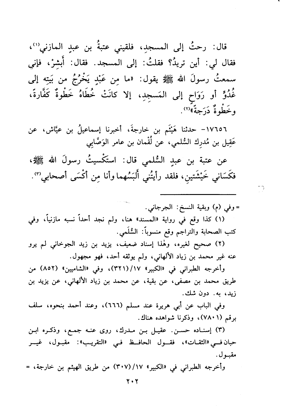 ١٧٦٥٦ - حَدَّثَنَا هَيْثَمُ بْنُ خَارِجَةَ، أَخْبَرَنَا إِسْمَاعِيلُ بْنُ عَيَّاشٍ، عَنْ عَقِيلِ بْنِ مُدْرِكٍ السُّلَمِيِّ، عَنْ لُقْمَانَ بْنِ عَامِرٍ الْوَصَابِيِّ، عَنْ عُتْبَةَ بْنِ عَبْدٍ السُّلَمِيِّ، قَالَ: " اسْتَكْسَيْتُ رَسُولَ اللهِ صَلَّى اللهُ عَلَيْهِ وَسَلَّمَ، فَكَسَانِي خَيْشَتَيْنِ فَلَقَدْ رَأَيْتُنِي أَلْبِسُهُمَا، وَأَنَا مِنْ أَكْسَى أَصْحَابِي " (٣)