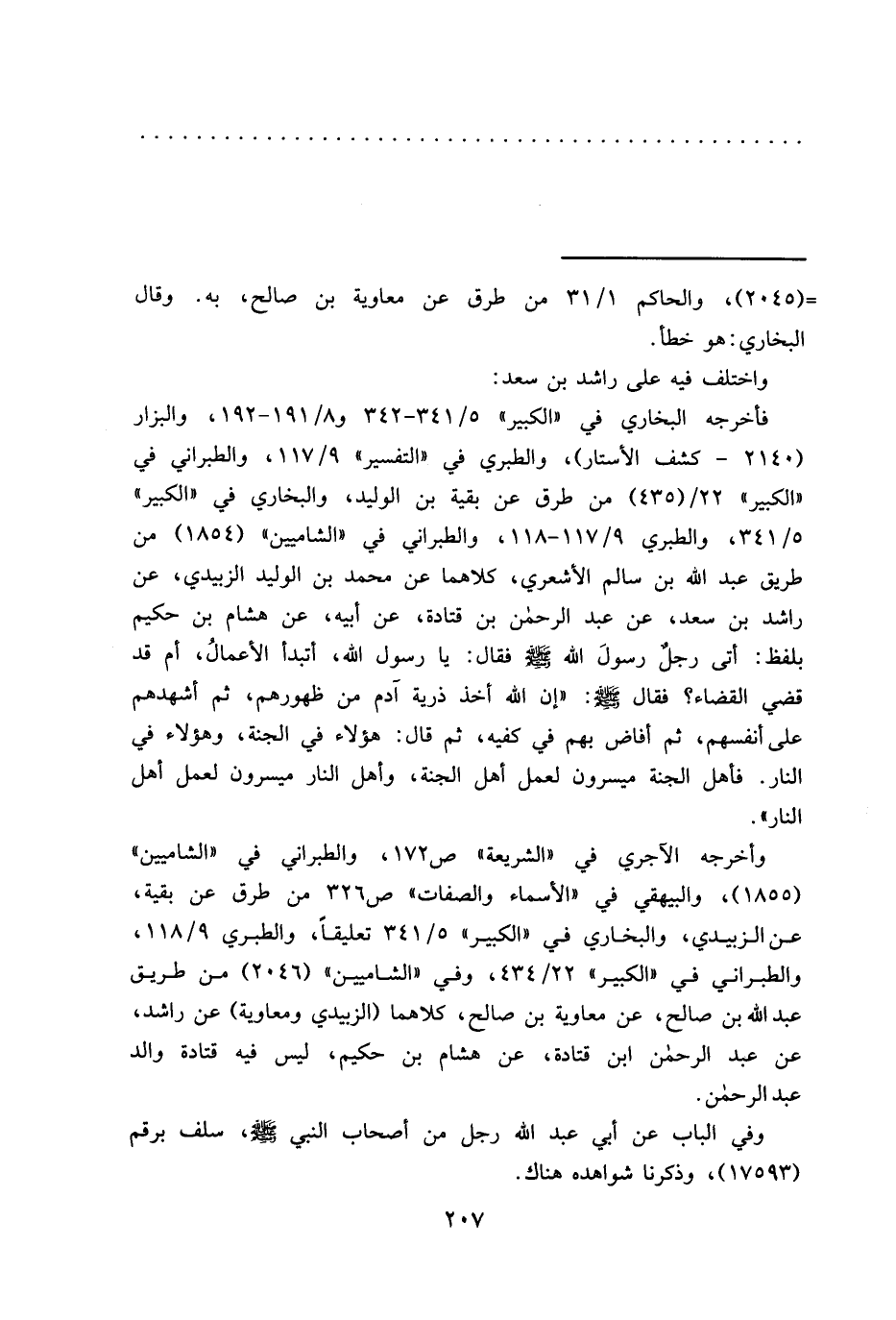وأخرجه الآجري في "الشريعة" ص١٧٢، والطبراني في "الشاميين" (١٨٥٥) ، والبيهقي في "الأسماء والصفات" ص ٣٢٦ من طرق عن بقية، عن الزبيدي، والبخاري في "الكبير" ٥/٣٤١ تعليقاً، والطبري ٩/١١٨، والطبراني في "الكبير" ٢٢/٤٣٤، وفي "الشاميين" (٢٠٤٦) من طريق عبد الله بن صالح، عن معاوية بن صالح، كلاهما (الزبيدي ومعاوية) عن راشد، عن عبد الرحمن ابن قتادة، عن هشام بن حكيم، ليس فيه قتادة والد عبد الرحمن.