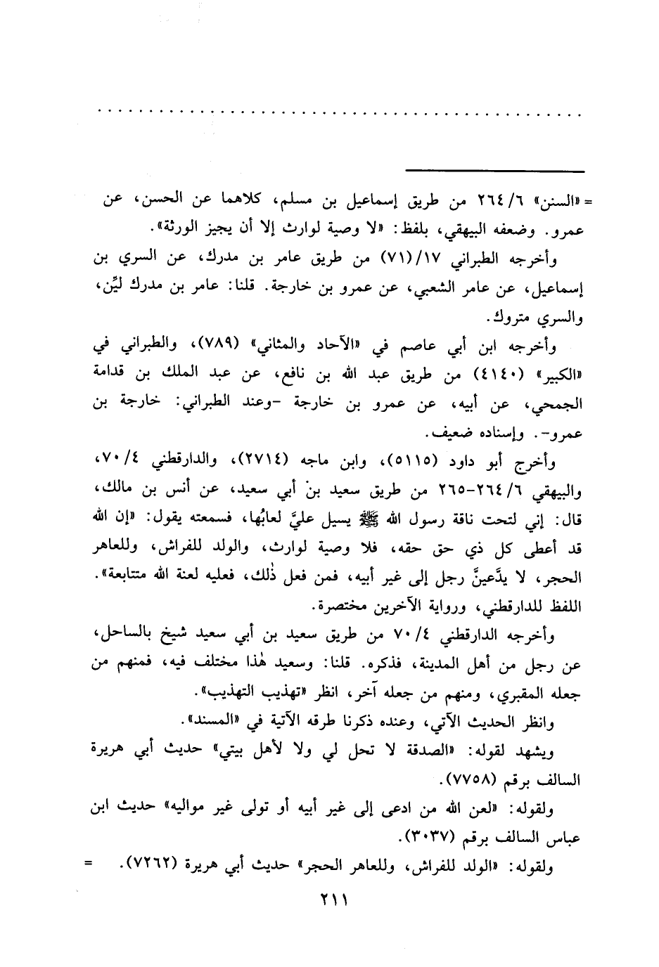 = "السنن" ٦/٢٦٤ من طريق إسماعيل بن مسلم، كلاهما عن الحسن، عن عمرو. وضعفه البيهقي، بلفظ: "لا وصية لوارث إلا أن يجيز الورثة".