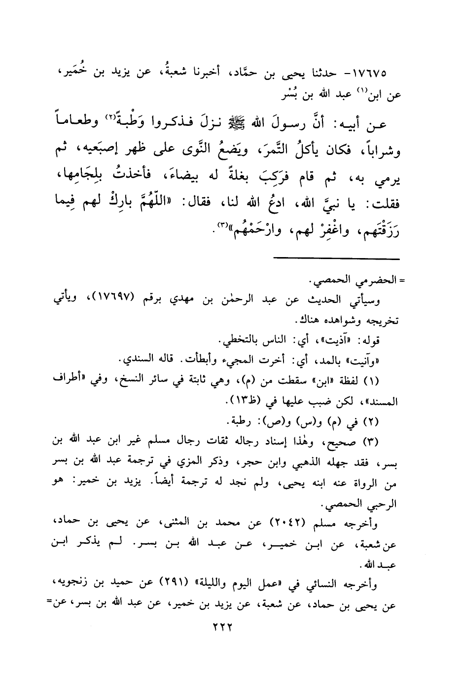 ١٧٦٧٥ - حَدَّثَنَا يَحْيَى بْنُ حَمَّادٍ، أَخْبَرَنَا شُعْبَةُ، عَنْ يَزِيدَ بْنِ خُمَيْرٍ، عَنْ ابْنِ (١) عَبْدِ اللهِ بْنِ بُسْرٍ، عَنْ أَبِيهِ، أَنَّ رَسُولَ اللهِ صَلَّى اللهُ عَلَيْهِ وَسَلَّمَ نَزَلَ فَذَكَرُوا وَطْبَةً (٢) ، وَطَعَامًا، وَشَرَابًا، فَكَانَ يَأْكُلُ التَّمْرَ، وَيَضَعُ النَّوَى عَلَى ظَهْرِ إِصْبِعَيْهِ، ثُمَّ يَرْمِي بِهِ، ثُمَّ قَامَ فَرَكِبَ بَغْلَةً لَهُ بَيْضَاءَ، فَأَخَذْتُ بِلِجَامِهَا، فَقُلْتُ يَا نَبِيَّ اللهِ، ادْعُ اللهَ لَنَا فَقَالَ: " اللهُمَّ بَارِكْ لَهُمْ فِيمَا رَزَقْتَهُمْ، وَاغْفِرْ لَهُمْ، وَارْحَمْهُمْ " (٣)