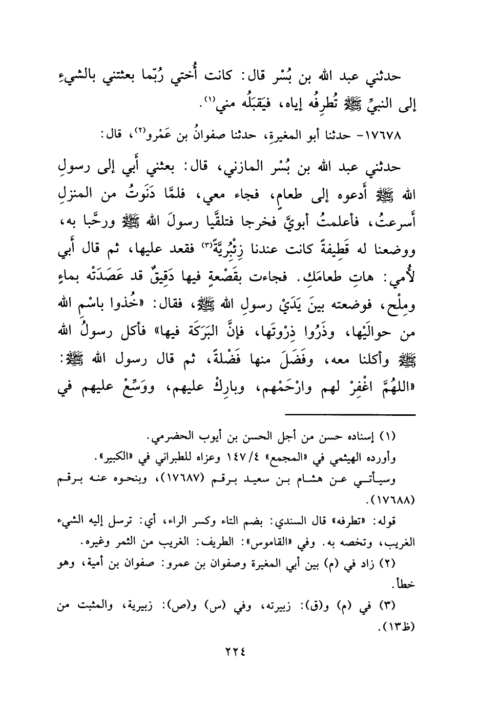 ١٧٦٧٨ - حَدَّثَنَا أَبُو الْمُغِيرَةِ، حَدَّثَنَا صَفْوَانُ بْنُ عَمْرٍو (٢) ، قَالَ: حَدَّثَنِي عَبْدُ اللهِ بْنُ بُسْرٍ الْمَازِنِيُّ، قَالَ: بَعَثَنِي أَبِي إِلَى رَسُولِ اللهِ صَلَّى اللهُ عَلَيْهِ وَسَلَّمَ أَدْعُوهُ إِلَى طَعَامٍ فَجَاءَ مَعِي، فَلَمَّا دَنَوْتُ مِنَ الْمَنْزِلِ أَسْرَعْتُ، فَأَعْلَمْتُ أَبَوَيَّ فَخَرَجَا فَتَلَقَّيَا رَسُولَ اللهِ صَلَّى اللهُ عَلَيْهِ وَسَلَّمَ وَرَحَّبَا بِهِ، وَوَضَعْنَا لَهُ قَطِيفَةً كَانَتْ عِنْدَنَا زِئْبِرِيَّةً (٣) فَقَعَدَ عَلَيْهَا، ثُمَّ قَالَ أَبِي لِأُمِّي: هَاتِ طَعَامَكِ، فَجَاءَتْ بِقَصْعَةٍ فِيهَا دَقِيقٌ قَدْ عَصَدَتْهُ بِمَاءٍ وَمِلْحٍ، فَوَضَعْتُهُ بَيْنَ يَدَيْ رَسُولِ اللهِ صَلَّى اللهُ عَلَيْهِ وَسَلَّمَ فَقَالَ: " خُذُوا بِسْمِ اللهِ مِنْ حَوَالَيْهَا، وَذَرُوا ذُرْوَتَهَا، فَإِنَّ الْبَرَكَةَ فِيهَا " فَأَكَلَ رَسُولُ اللهِ صَلَّى اللهُ عَلَيْهِ وَسَلَّمَ، وَأَكَلْنَا مَعَهُ، وَفَضَلَ مِنْهَا فَضْلَةٌ، ثُمَّ قَالَ رَسُولُ اللهِ صَلَّى اللهُ عَلَيْهِ وَسَلَّمَ: " اللهُمَّ اغْفِرْ لَهُمْ، وَارْحَمْهُمْ، وَبَارِكْ عَلَيْهِمْ، وَوَسِّعْ عَلَيْهِمْ فِي