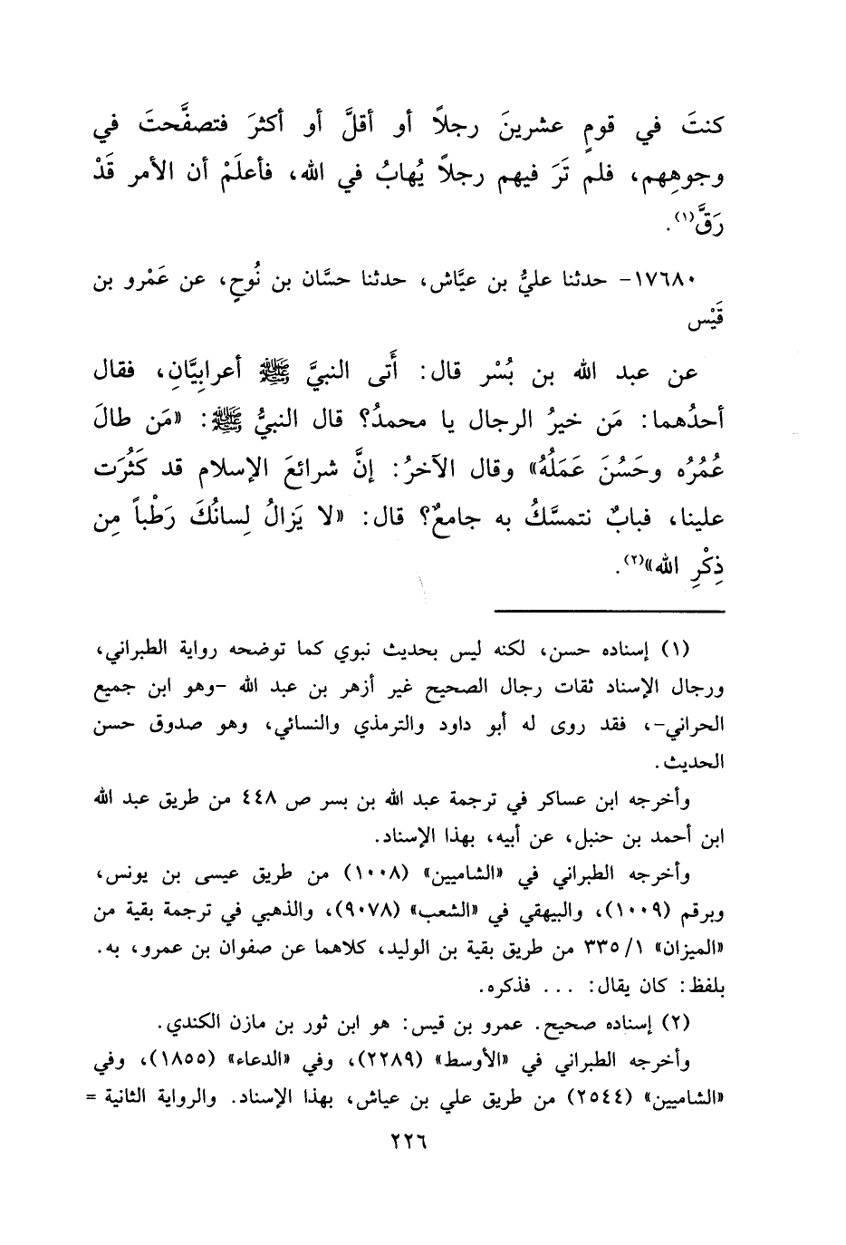 ١٧٦٨٠ - حَدَّثَنَا عَلِيُّ بْنُ عَيَّاشٍ، حَدَّثَنَا حَسَّانُ بْنُ نُوحٍ، عَنْ عَمْرِو بْنِ قَيْسٍ، عَنْ عَبْدِ اللهِ بْنِ بُسْرٍ، قَالَ: أَتَى النَّبِيَّ صَلَّى اللهُ عَلَيْهِ وَسَلَّمَ أَعْرَابِيَّانِ، فَقَالَ أَحَدُهُمَا: مَنْ خَيْرُ الرِّجَالِ يَا مُحَمَّدُ؟ قَالَ النَّبِيُّ صَلَّى اللهُ عَلَيْهِ وَسَلَّمَ: " مَنْ طَالَ عُمْرُهُ، وَحَسُنَ عَمَلُهُ "، وَقَالَ الْآخَرُ: إِنَّ شَرَائِعَ الْإِسْلَامِ قَدْ كَثُرَتْ عَلَيْنَا، فَبَابٌ نَتَمَسَّكُ بِهِ جَامِعٌ؟ قَالَ: " لَا يَزَالُ لِسَانُكَ رَطْبًا مِنْ ذِكْرِ اللهِ " (٢)