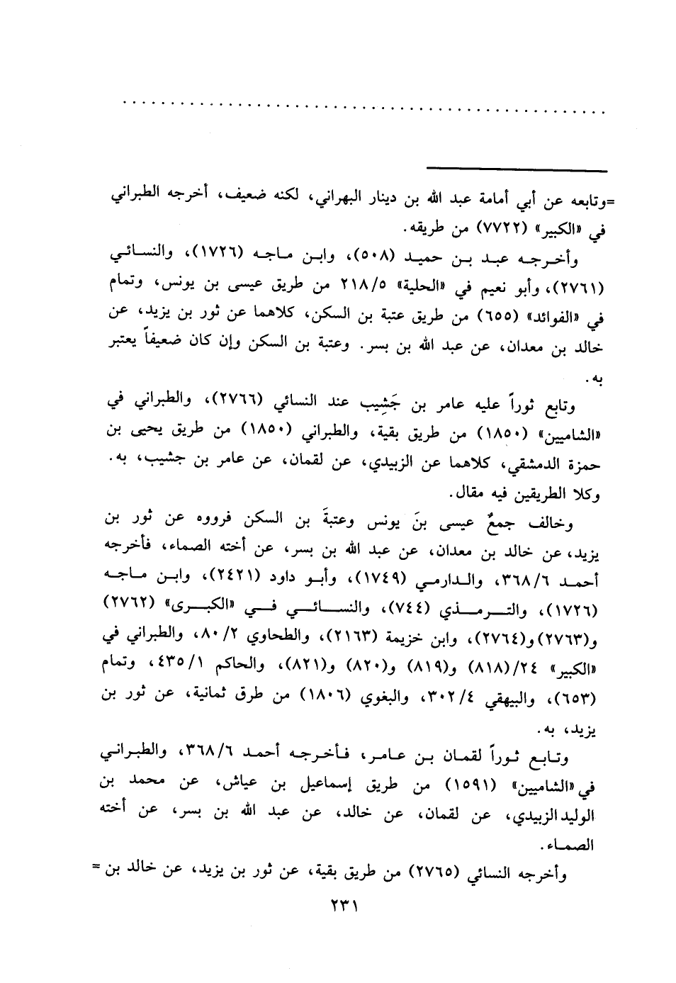وخالف جمعٌ عيسى بنَ يونس وعتبةَ بن السكن فرووه عن ثور بن يزيد، عن خالد بن معدان، عن عبد الله بن بسر، عن أخته الصماء، فأخرجه أحمد ٦/٣٦٨، والدارمي (١٧٤٩) ، وأبو داود (٢٤٢١) ، وابن ماجه (١٧٢٦) ، والترمذي (٧٤٤) ، والنسائي في "الكبرى" (٢٧٦٢) و (٢٧٦٣) و (٢٧٦٤) ، وابن خزيمة (٢١٦٣) ، والطحاوي ٢/٨٠، والطبراني في "الكبير" ٢٤/ (٨١٨) و (٨١٩) و (٨٢٠) و (٨٢١) ، والحاكم ١/٤٣٥، وتمام (٦٥٣) ، والبيهقي ٤/٣٠٢، والبغوي (١٨٠٦) من طرق ثمانية، عن ثور بن يزيد، به.