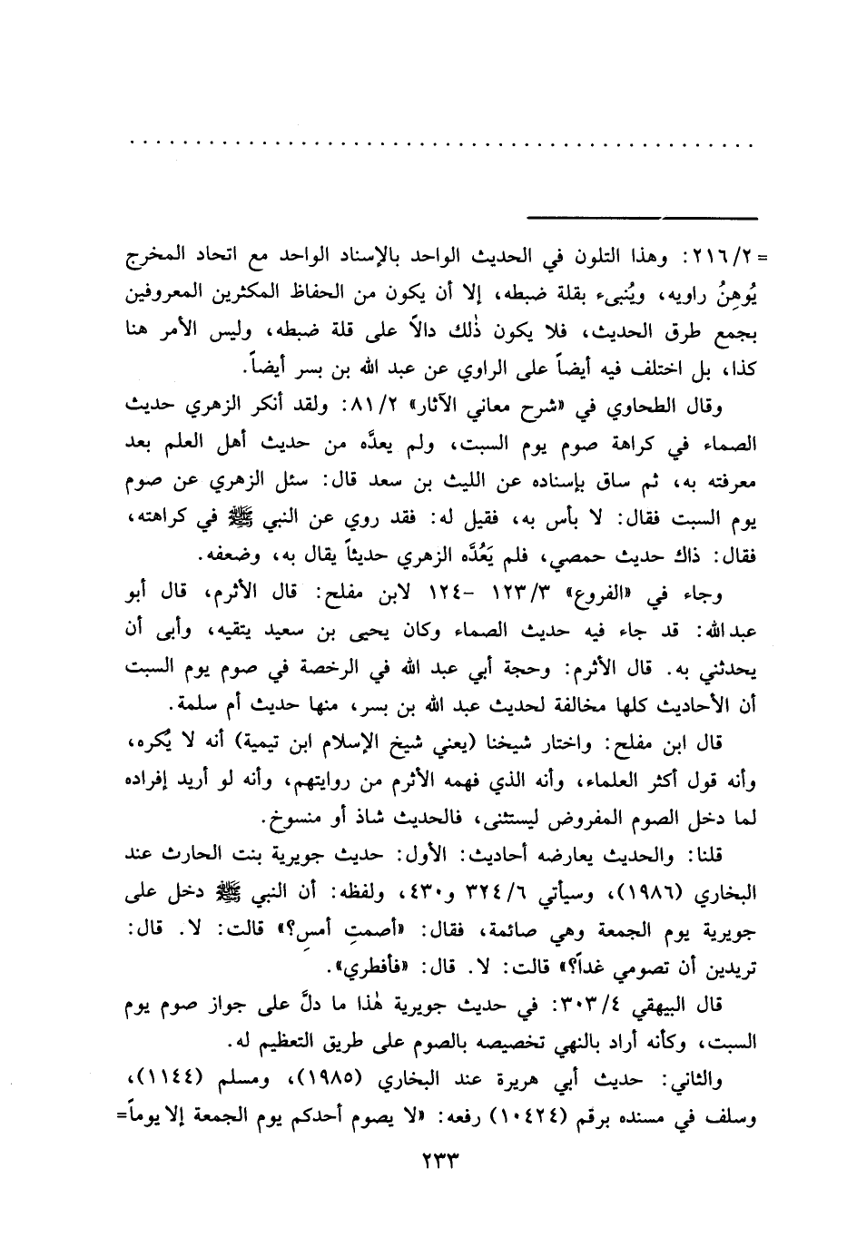 قال البيهقي ٤/٣٠٣: في حديث جويرية هذا ما دلَّ على جواز صوم يوم السبت، وكأنه أراد بالنهي تخصيصه بالصوم على طريق التعظيم له.