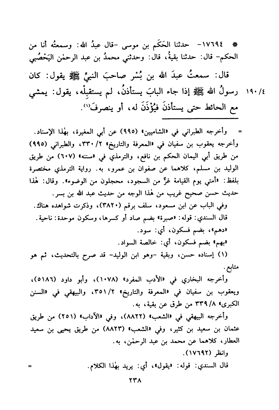 * ١٧٦٩٤ - حَدَّثَنَا الْحَكَمُ بْنُ مُوسَى، قَالَ: عَبْدُ اللهِ، وَسَمِعْتُهُ أَنَا مِنَ الْحَكَمِ، قَالَ: حَدَّثَنَا بَقِيَّةُ، قَالَ: وَحَدَّثَنِي مُحَمَّدُ بْنُ عَبْدِ الرَّحْمَنِ الْيَحْصَبِيُّ، قَالَ: سَمِعْتُ عَبْدَ اللهِ بْنَ بُسْرٍ، صَاحِبَ النَّبِيِّ صَلَّى اللهُ عَلَيْهِ وَسَلَّمَ يَقُولُ: " كَانَ رَسُولُ اللهِ صَلَّى اللهُ عَلَيْهِ وَسَلَّمَ، إِذَا جَاءَ الْبَابَ يَسْتَأْذِنُ لَمْ يَسْتَقْبِلْهُ "، يَقُولُ: " يَمْشِي مَعَ الْحَائِطِ حَتَّى يَسْتَأْذِنَ، فَيُؤْذَنَ لَهُ، أَوْ يَنْصَرِفَ " (١)