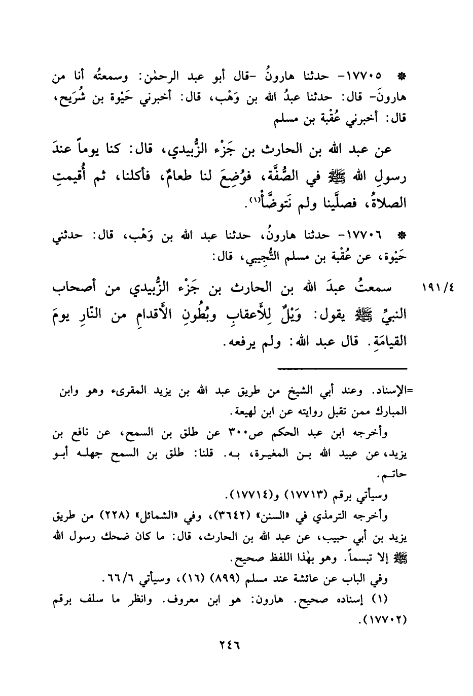 * ١٧٧٠٦ - حَدَّثَنَا هَارُونَ، حَدَّثَنَا عَبْدُ اللهِ بْنُ وَهْبٍ، قَالَ: حَدَّثَنِي حَيْوَةُ، عَنْ عُقْبَةَ بْنِ مُسْلِمٍ التُّجِيبِيِّ، قَالَ: سَمِعْتُ عَبْدَ اللهِ بْنَ الْحَارِثِ بْنِ جَزْءٍ الزُّبَيْدِيَّ، مِنْ أَصْحَابِ النَّبِيِّ صَلَّى اللهُ عَلَيْهِ وَسَلَّمَ يَقُولُ: " وَيْلٌ لِلْأَعْقَابِ، وَبُطُونِ الْأَقْدَامِ مِنَ النَّارِ يَوْمَ الْقِيَامَةِ " قَالَ: عَبْدُ اللهِ: " وَلَمْ يَرْفَعْهُ "،