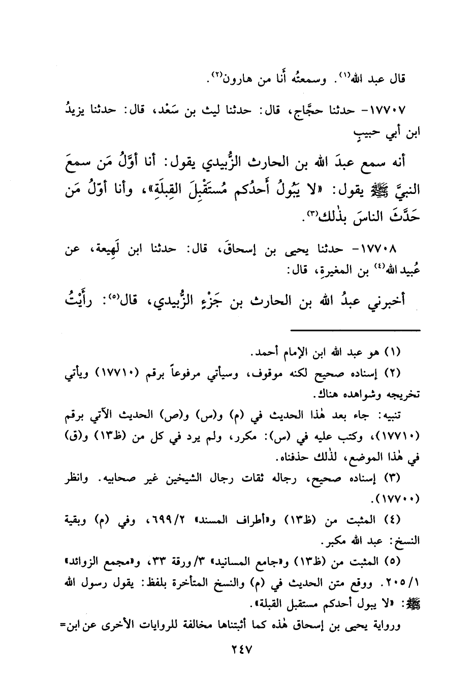 ١٧٧٠٧ - حَدَّثَنَا حَجَّاجٌ، قَالَ: حَدَّثَنَا لَيْثُ بْنُ سَعْدٍ، قَالَ: حَدَّثَنَا يَزِيدُ بْنُ أَبِي حَبِيبٍ، أَنَّهُ سَمِعَ عَبْدَ اللهِ بْنَ الْحَارِثِ الزُّبَيْدِيَّ، يَقُولُ: أَنَا أَوَّلُ مَنْ سَمِعَ النَّبِيَّ صَلَّى اللهُ عَلَيْهِ وَسَلَّمَ يَقُولُ: " لَا يَبُولُ أَحَدُكُمْ مُسْتَقْبِلَ الْقِبْلَةِ " وَأَنَا أَوَّلُ مَنْ حَدَّثَ النَّاسَ بِذَلِكَ " (٣)