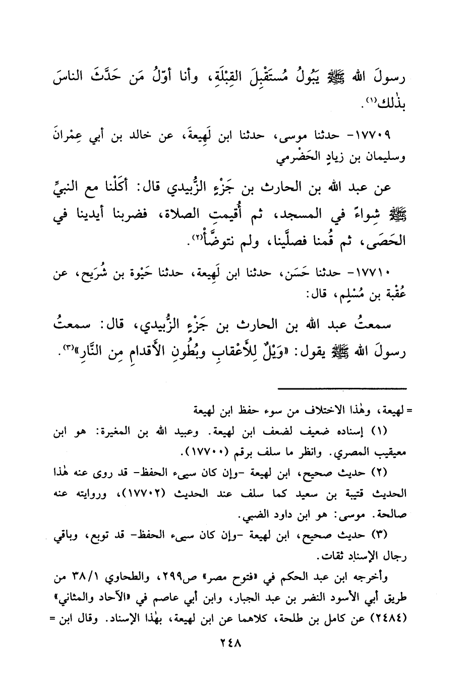 ١٧٧١٠ - حَدَّثَنَا حَسَنٌ، حَدَّثَنَا ابْنُ لَهِيعَةَ، حَدَّثَنَا حَيْوَةُ بْنُ شُرَيْحٍ، عَنْ عُقْبَةَ بْنِ مُسْلِمٍ، قَالَ: سَمِعْتُ عَبْدَ اللهِ بْنَ الْحَارِثِ بْنِ جَزْءٍ الزُّبَيْدِيَّ، قَالَ: سَمِعْتُ رَسُولَ اللهِ صَلَّى اللهُ عَلَيْهِ وَسَلَّمَ يَقُولُ: " وَيْلٌ لِلْأَعْقَابِ، وَبُطُونِ الْأَقْدَامِ مِنَ النَّارِ " (٣)
