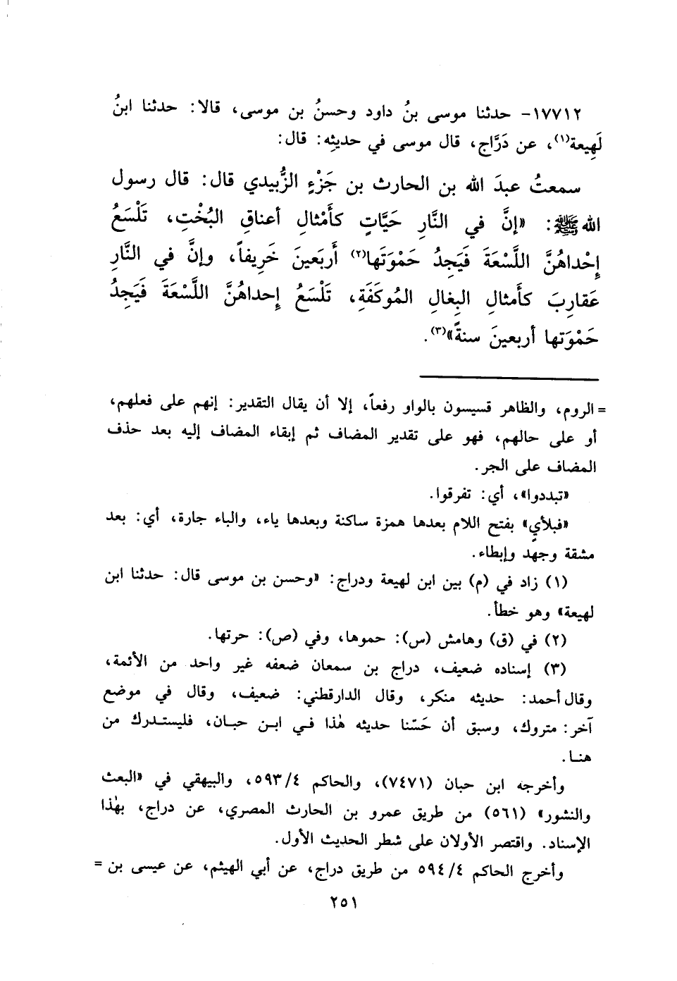 ١٧٧١٢ - حَدَّثَنَا مُوسَى بْنُ دَاوُدَ، وَحَسَنُ بْنُ مُوسَى، قَالَا: حَدَّثَنَا ابْنُ لَهِيعَةَ (١) ، عَنْ دَرَّاجٍ، قَالَ مُوسَى: فِي حَدِيثِهِ قَالَ: سَمِعْتُ عَبْدَ اللهِ بْنَ الْحَارِثِ بْنِ جَزْءٍ الزُّبَيْدِيَّ، قَالَ: قَالَ رَسُولُ اللهِ صَلَّى اللهُ عَلَيْهِ وَسَلَّمَ: " إِنَّ فِي النَّارِ حَيَّاتٍ كَأَمْثَالِ أَعْنَاقِ الْبُخْتِ، تَلْسَعُ إِحْدَاهُنَّ اللَّسْعَةَ فَيَجِدُ حَمْوَتَهَا (٢) أَرْبَعِينَ خَرِيفًا، وَإِنَّ فِي النَّارِ عَقَارِبَ كَأَمْثَالِ الْبِغَالِ الْمُوكَفَةِ، تَلْسَعُ إِحْدَاهُنَّ اللَّسْعَةَ، فَيَجِدُ حَمْوَتَهَا أَرْبَعِينَ سَنَةً " (٣)