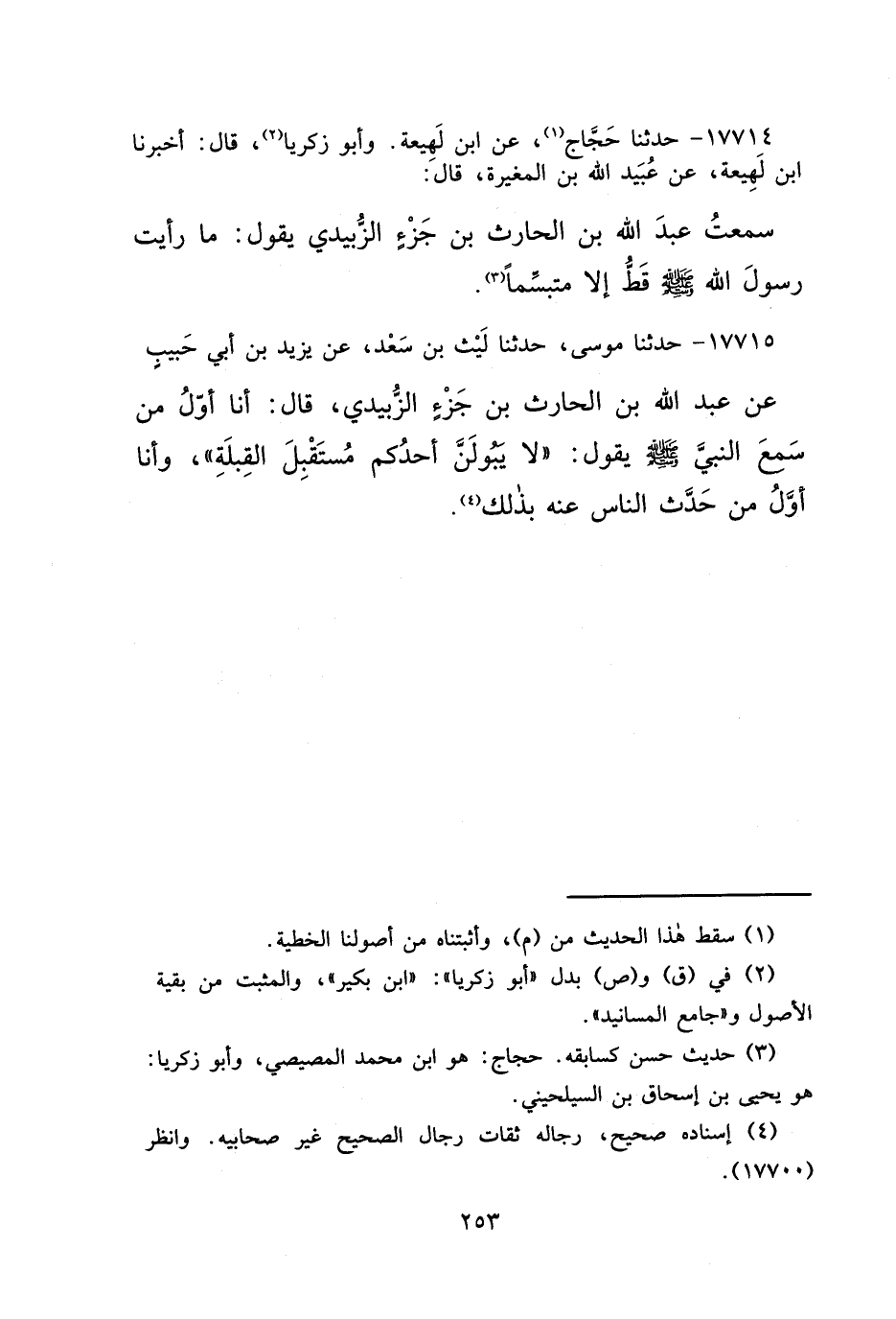 ١٧٧١٥ - حَدَّثَنَا مُوسَى، حَدَّثَنَا لَيْثُ بْنُ سَعْدٍ، عَنْ يَزِيدَ بْنِ أَبِي حَبِيبٍ، عَنْ عَبْدِ اللهِ بْنِ الْحَارِثِ بْنِ جَزْءٍ الزُّبَيْدِيِّ، قَالَ: أَنَا أَوَّلُ مَنْ سَمِعَ النَّبِيَّ صَلَّى اللهُ عَلَيْهِ وَسَلَّمَ يَقُولُ: " لَا يَبُولَنَّ أَحَدُكُمْ مُسْتَقْبِلَ الْقِبْلَةِ " وَأَنَا أَوَّلُ مَنْ حَدَّثَ النَّاسَ عَنْهُ بِذَلِكَ (٤)