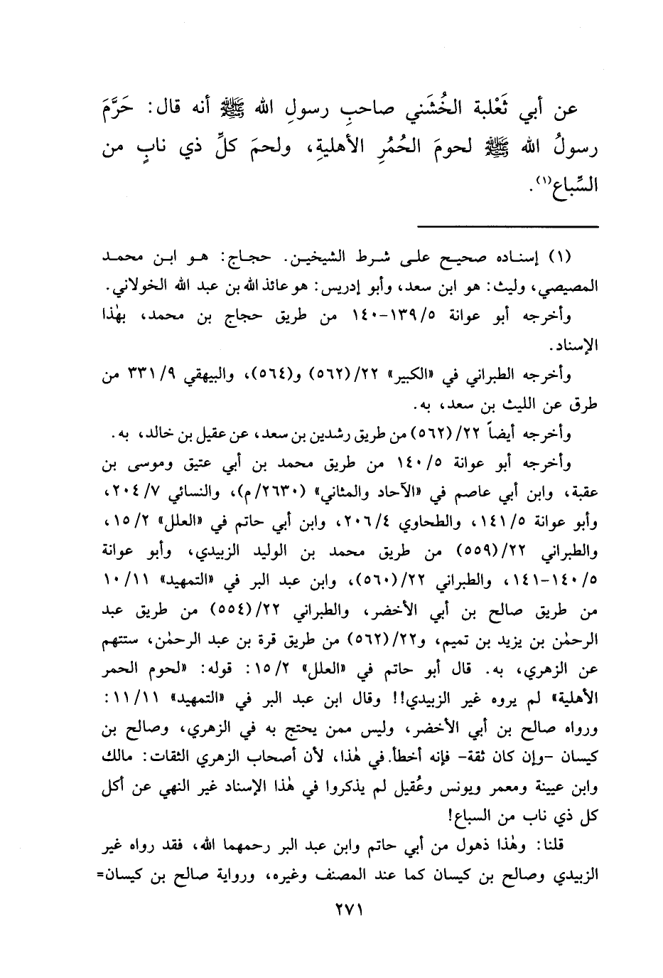 عَنْ أَبِي ثَعْلَبَةَ الْخُشَنِيِّ، صَاحِبِ رَسُولِ اللهِ صَلَّى اللهُ عَلَيْهِ وَسَلَّمَ أَنَّهُ قَالَ: " حَرَّمَ رَسُولُ اللهِ صَلَّى اللهُ عَلَيْهِ وَسَلَّمَ لُحُومَ الْحُمُرِ الْأَهْلِيَّةِ، وَلَحْمَ كُلِّ ذِي نَابٍ مِنَ السِّبَاعِ " (١)