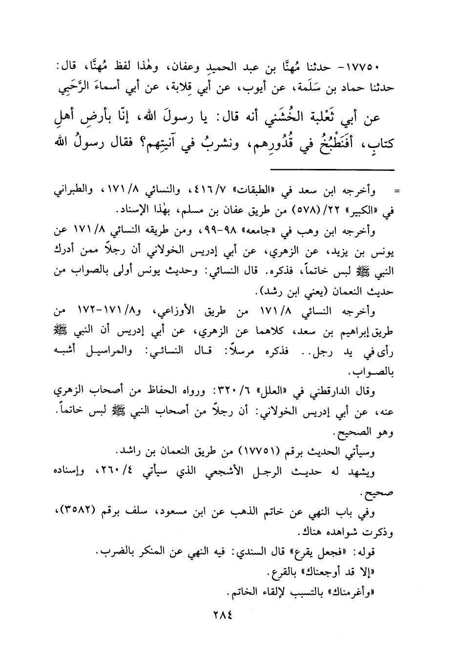 ١٧٧٥٠ - حَدَّثَنَا مُهَنَّا بْنُ عَبْدِ الْحَمِيدِ، وَعَفَّانُ وَهَذَا لَفْظُ مُهَنَّا، قَالَ: حَدَّثَنَا حَمَّادُ بْنُ سَلَمَةَ، عَنْ أَيُّوبَ، عَنْ أَبِي قِلَابَةَ، عَنْ أَبِي أَسْمَاءَ الرَّحَبِيِّ، عَنْ أَبِي ثَعْلَبَةَ الْخُشَنِيِّ، أَنَّهُ قَالَ: يَا رَسُولَ اللهِ، إِنَّا بِأَرْضِ أَهْلِ كِتَابٍ، أَفَنَطْبُخُ فِي قُدُورِهِمْ، وَنَشْرَبُ فِي آنِيَتِهِمْ؟ فَقَالَ رَسُولُ اللهِ صَلَّى اللهُ عَلَيْهِ وَسَلَّمَ: "