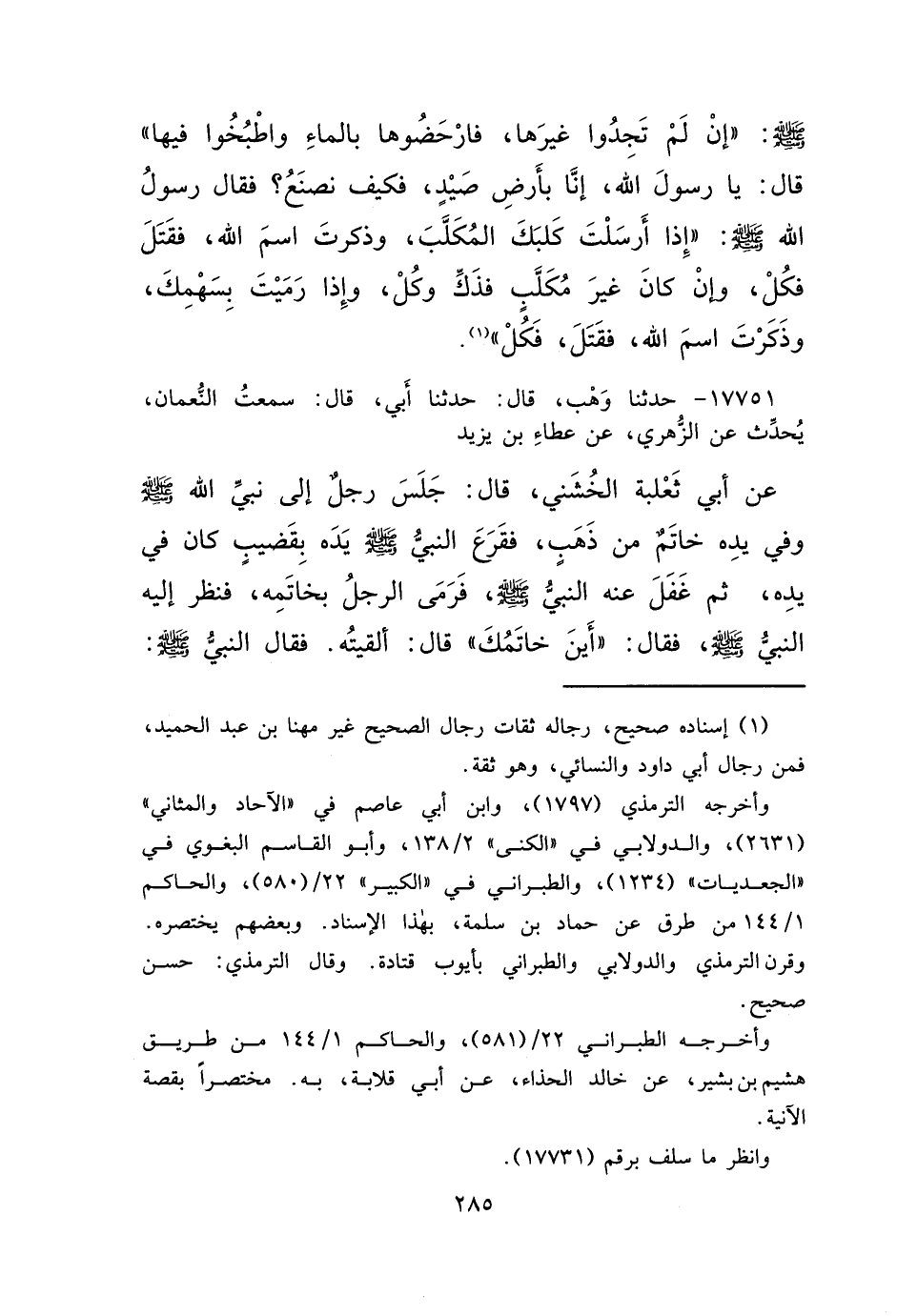 ١٧٧٥١ - حَدَّثَنَا وَهْبٌ، قَالَ: حَدَّثَنَا أَبِي، قَالَ: سَمِعْتُ النُّعْمَانَ، يُحَدِّثُ عَنِ الزُّهْرِيِّ، عَنْ عَطَاءِ بْنِ يَزِيدَ، عَنْ أَبِي ثَعْلَبَةَ الْخُشَنِيِّ، قَالَ: جَلَسَ رَجُلٌ إِلَى نَبِيِّ اللهِ صَلَّى اللهُ عَلَيْهِ وَسَلَّمَ وَفِي يَدِهِ خَاتَمٌ مِنْ ذَهَبٍ، فَقَرَعَ النَّبِيُّ صَلَّى اللهُ عَلَيْهِ وَسَلَّمَ يَدَهُ بِقَضِيبٍ كَانَ فِي يَدِهِ، ثُمَّ غَفَلَ عَنْهُ النَّبِيُّ صَلَّى اللهُ عَلَيْهِ وَسَلَّمَ، فَرَمَى الرَّجُلُ بِخَاتَمِهِ، فَنَظَرَ إِلَيْهِ النَّبِيُّ صَلَّى اللهُ عَلَيْهِ وَسَلَّمَ فَقَالَ: " أَيْنَ خَاتَمُكَ؟ " قَالَ: أَلْقَيْتُهُ. فَقَالَ النَّبِيُّ صَلَّى اللهُ عَلَيْهِ وَسَلَّمَ: "
