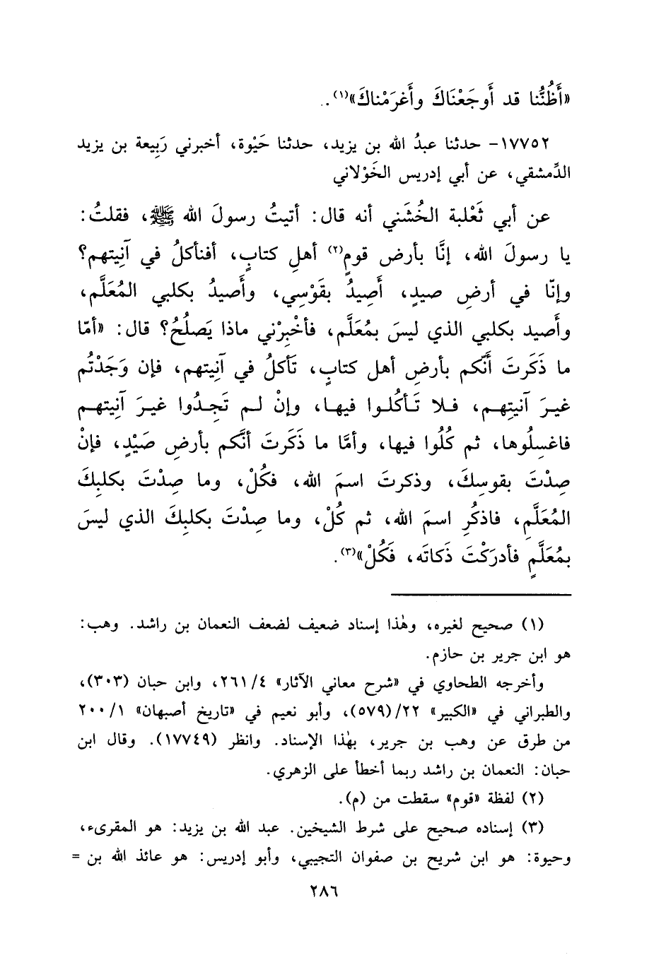 ١٧٧٥٢ - حَدَّثَنَا عَبْدُ اللهِ بْنُ يَزِيدَ، حَدَّثَنَا حَيْوَةُ، أَخْبَرَنِي رَبِيعَةُ بْنُ يَزِيدَ الدِّمَشْقِيُّ، عَنْ أَبِي إِدْرِيسَ الْخَوْلَانِيِّ، عَنْ أَبِي ثَعْلَبَةَ الْخُشَنِيِّ، أَنَّهُ قَالَ: أَتَيْتُ رَسُولَ اللهِ صَلَّى اللهُ عَلَيْهِ وَسَلَّمَ، فَقُلْتُ: يَا رَسُولَ اللهِ، إِنَّا بِأَرْضِ قَوْمٍ (٢) أَهْلِ كِتَابٍ، أَفَنَأْكُلُ فِي آنِيَتِهِمْ؟ وَإِنَّا فِي أَرْضِ صَيْدٍ، أَصِيدُ بِقَوْسِي، وَأَصِيدُ بِكَلْبِي الْمُعَلَّمِ، وَأَصِيدُ بِكَلْبِي الَّذِي لَيْسَ بِمُعَلَّمٍ، فَأَخْبِرْنِي مَاذَا يَصْلُحُ؟ قَالَ " أَمَّا مَا ذَكَرْتَ أَنَّكُمْ بِأَرْضِ أَهْلِ كِتَابٍ تَأْكُلُ فِي آنِيَتِهِمْ، فَإِنْ وَجَدْتُمْ غَيْرَ آنِيَتِهِمْ فَلَا تَأْكُلُوا فِيهَا، وَإِنْ لَمْ تَجِدُوا غَيْرَ آنِيَتِهِمْ فَاغْسِلُوهَا، ثُمَّ كُلُوا فِيهَا، وَأَمَّا مَا ذَكَرْتَ أَنَّكُمْ بِأَرْضِ صَيْدٍ فَإِنْ صِدْتَ بِقَوْسِكَ وَذَكَرْتَ اسْمَ اللهِ فَكُلْ، وَمَا صِدْتَ بِكَلْبِكَ الْمُعَلَّمِ فَاذْكُرْ اسْمَ اللهِ ثُمَّ كُلْ، وَمَا صِدْتَ بِكَلْبِكَ الَّذِي لَيْسَ بِمُعَلَّمٍ فَأَدْرَكْتَ ذَكَاتَهُ فَكُلْ " (٣)